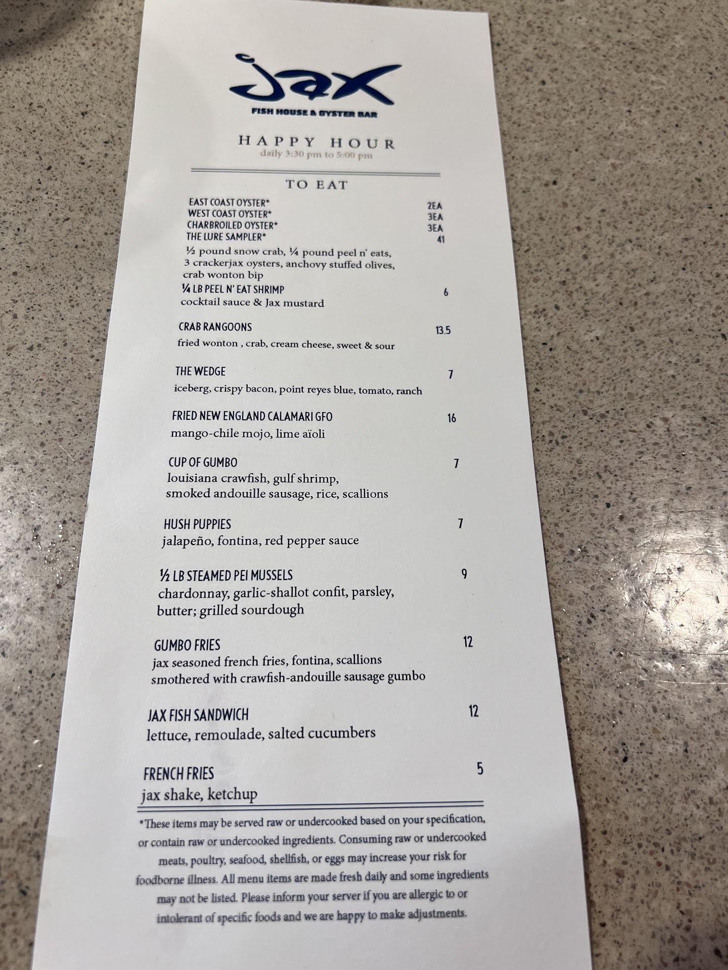Read moreHave been to Jax several times with an overall good experience in the past so decided to go to Jax last Wednesday (3/16/22) to celebrate a birthday. We ordered a dozen oysters, Calamari, 4 beers on happy hour and for entrees: 2 large Caesar salads w/ salmon and two more beers. Our bill was just shy of $170.