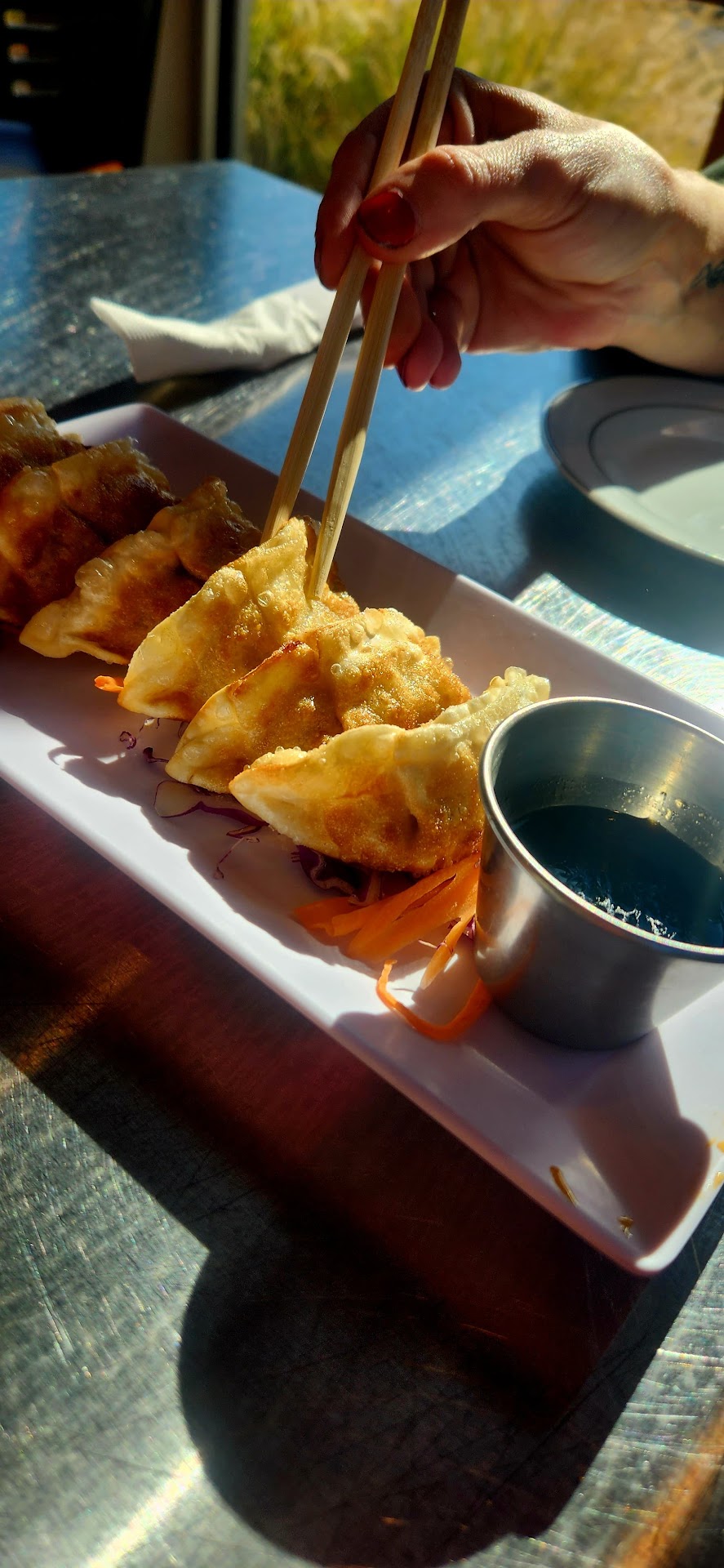 We shared a plate of the fried gyoza and dinner sized plate of drunken noodles (extra spicey). We were not disappointed! It was absolutely delicious; the heat was perfect and exactly what we were looking for! There are a few Asian restaurants in town that are quite good, this may now be our favorite. We still have plenty to try of course, but it was a stellar first impression. On top of that, the price was very reasonable. It was enough to fill us up (even got a small to-go box) and our meal ended up being just about 20 dollars. Which honestly, would be hard pressed to even do at a fast-food place right now.