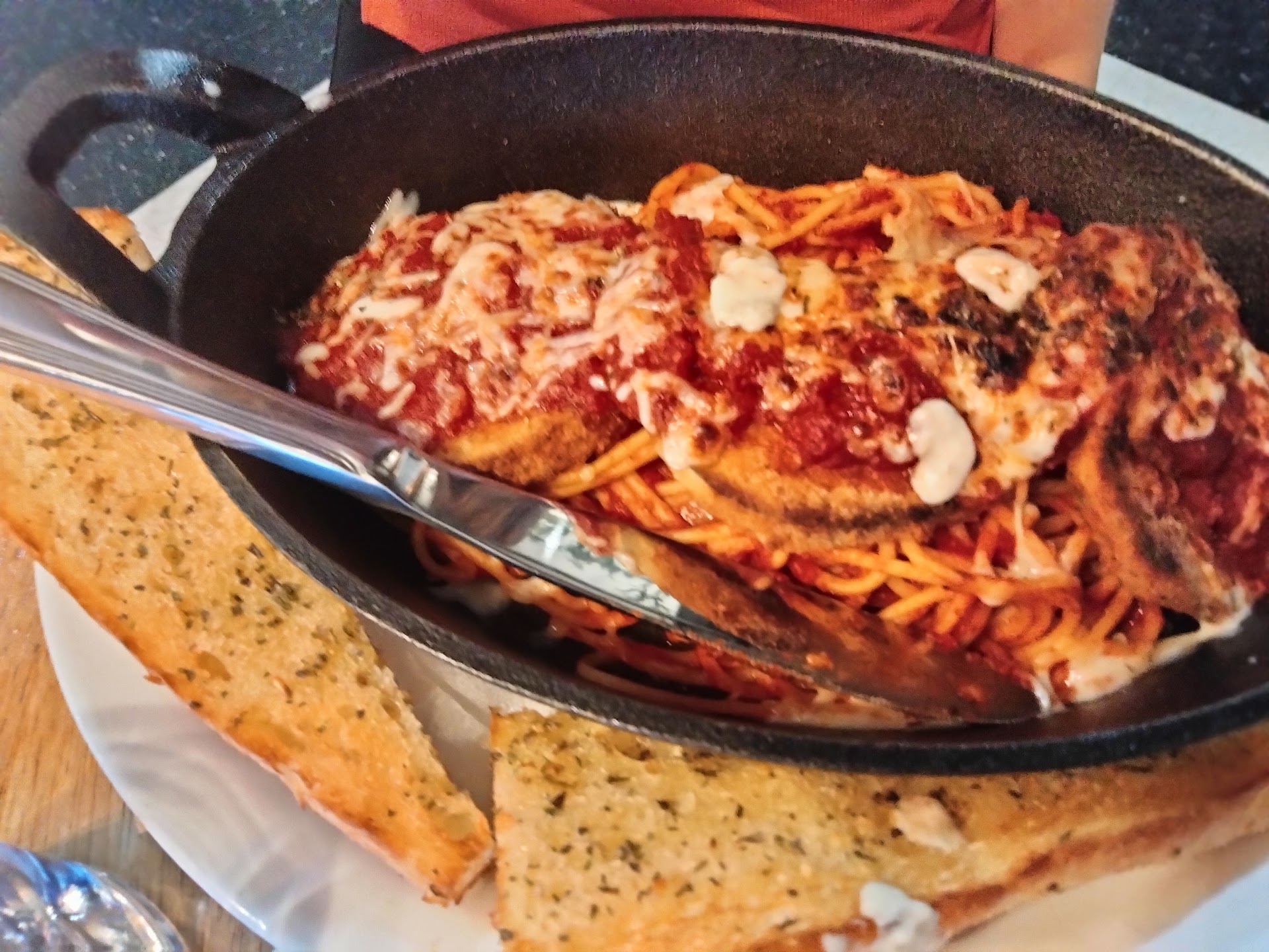 For entrees we got a baked chicken alfredo and a chicken parmigiana w/spaghetti marinara (classic Italian staples that we love). The chicken even stayed crispy around the edges, so chefâs kiss for that.