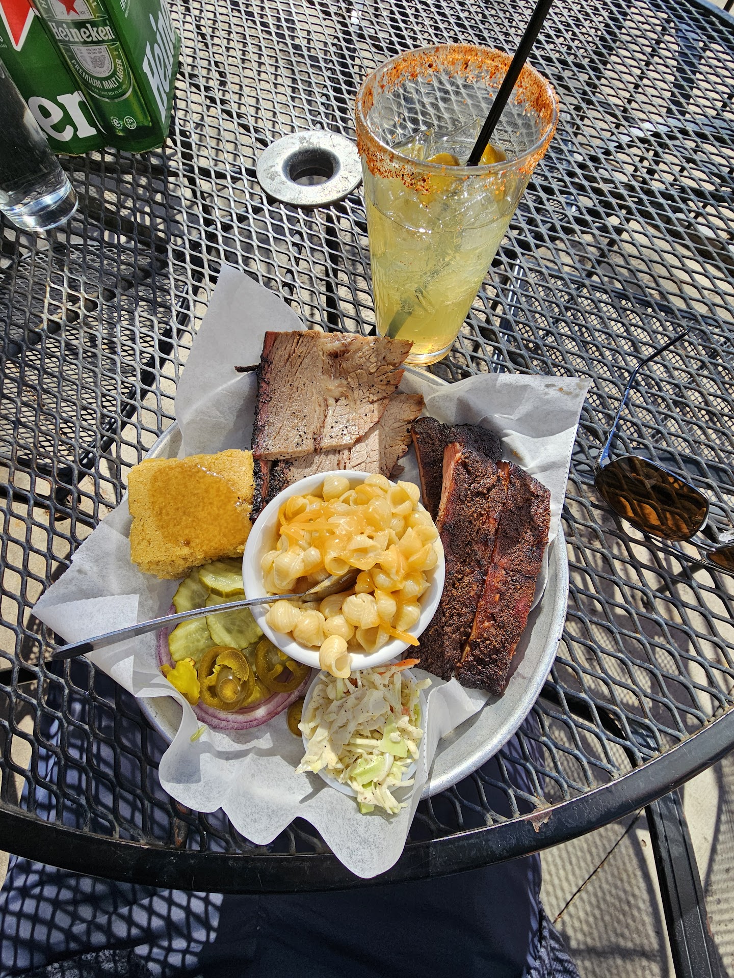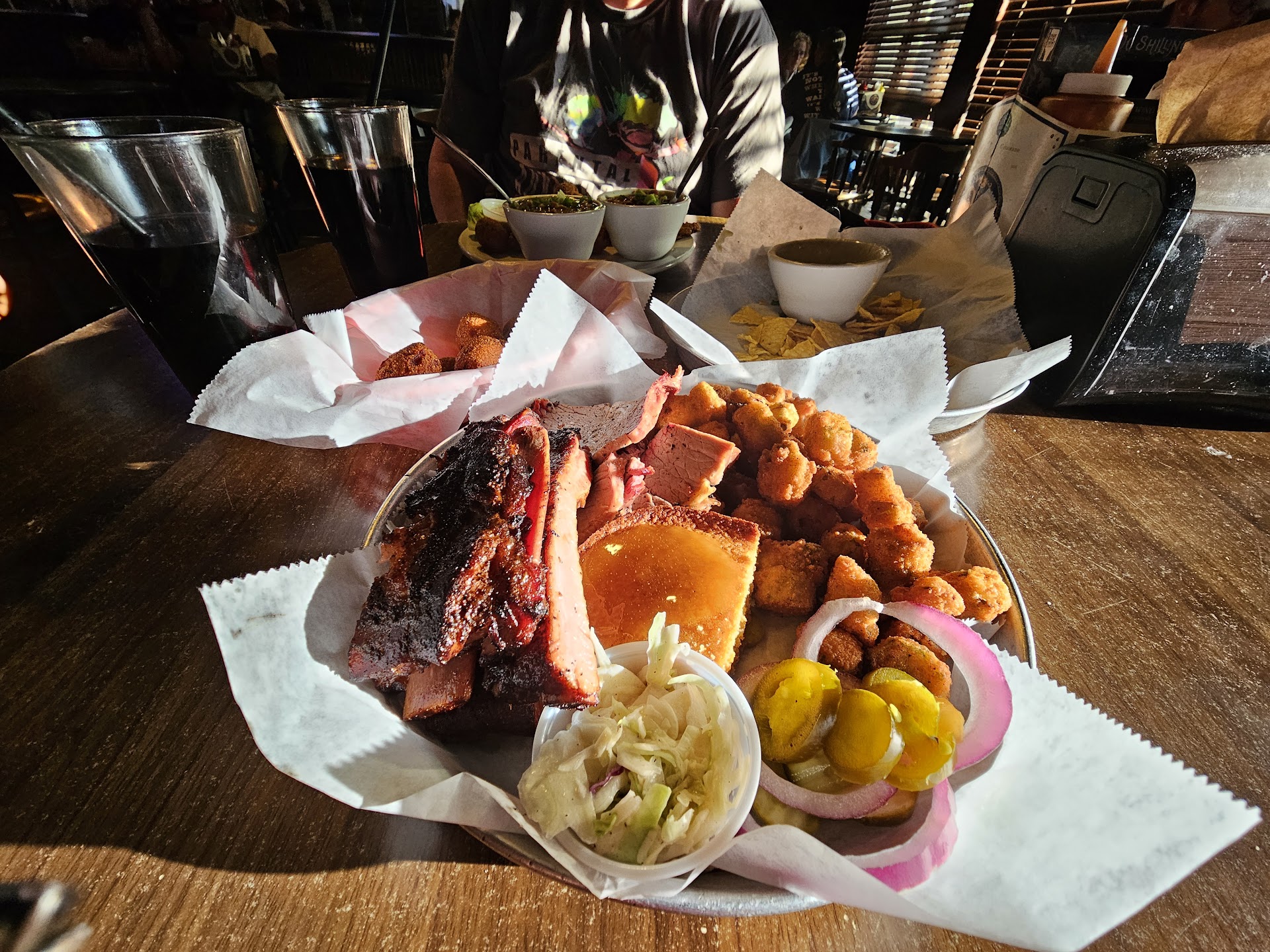 Now, that being said, let's talk BBQ! I being from VERY Southern Louisiana, have a very high standards when it comes to BBQ. Let me tell you, it has NOT been easy finding any BBQ here in the Colorado state that satisfies my hunger for good, smokey meats! Mo Jeauxs is an exception however! Right off the bat you receive very friendly and fast service from the employees there! They have an air of ease about them and in turn the atmosphere reflects that! People enjoy themselves with good company and great food! The music/TV weren't too loud so you could enjoy a good conversation without yelling! Kids are welcome here as well! Now to the good and somewhat ok parts, the FOOD!