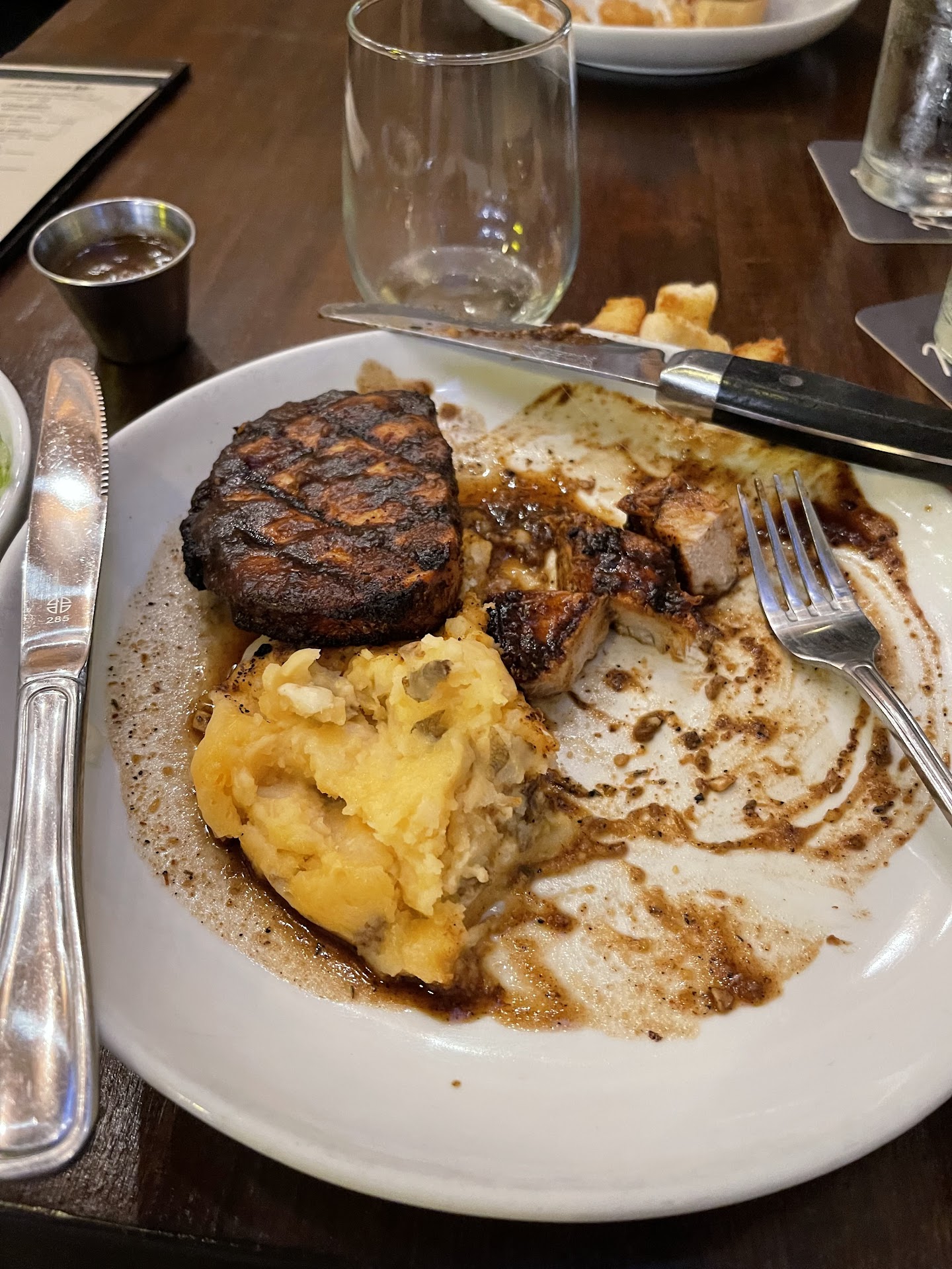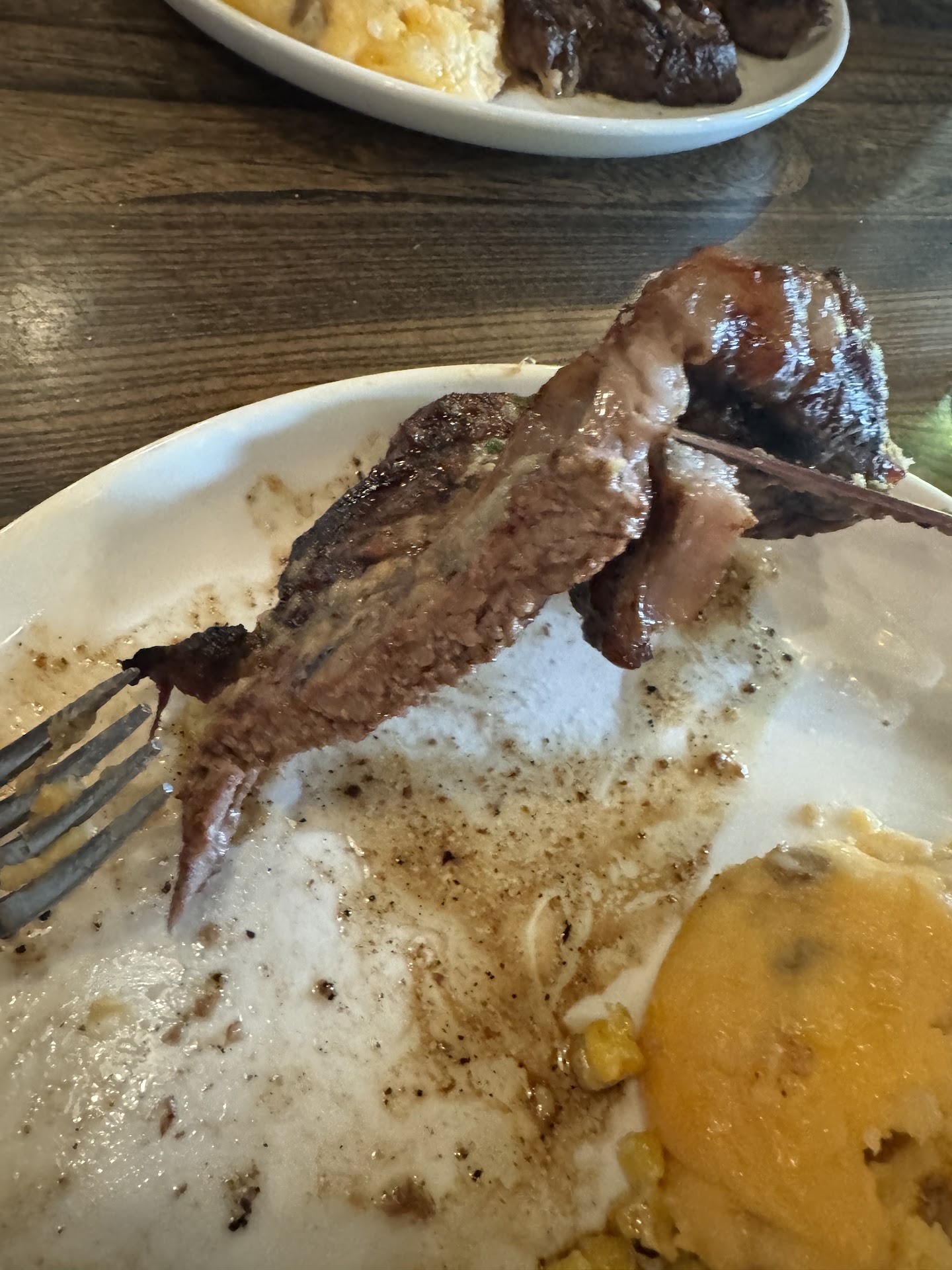 Horrible service aside, my ribeye was paper thin and partially burnt. The mashed potatoes and corn had solidified into a mass and didnât so much as slide on the plate once the unappetizing dish was delivered.