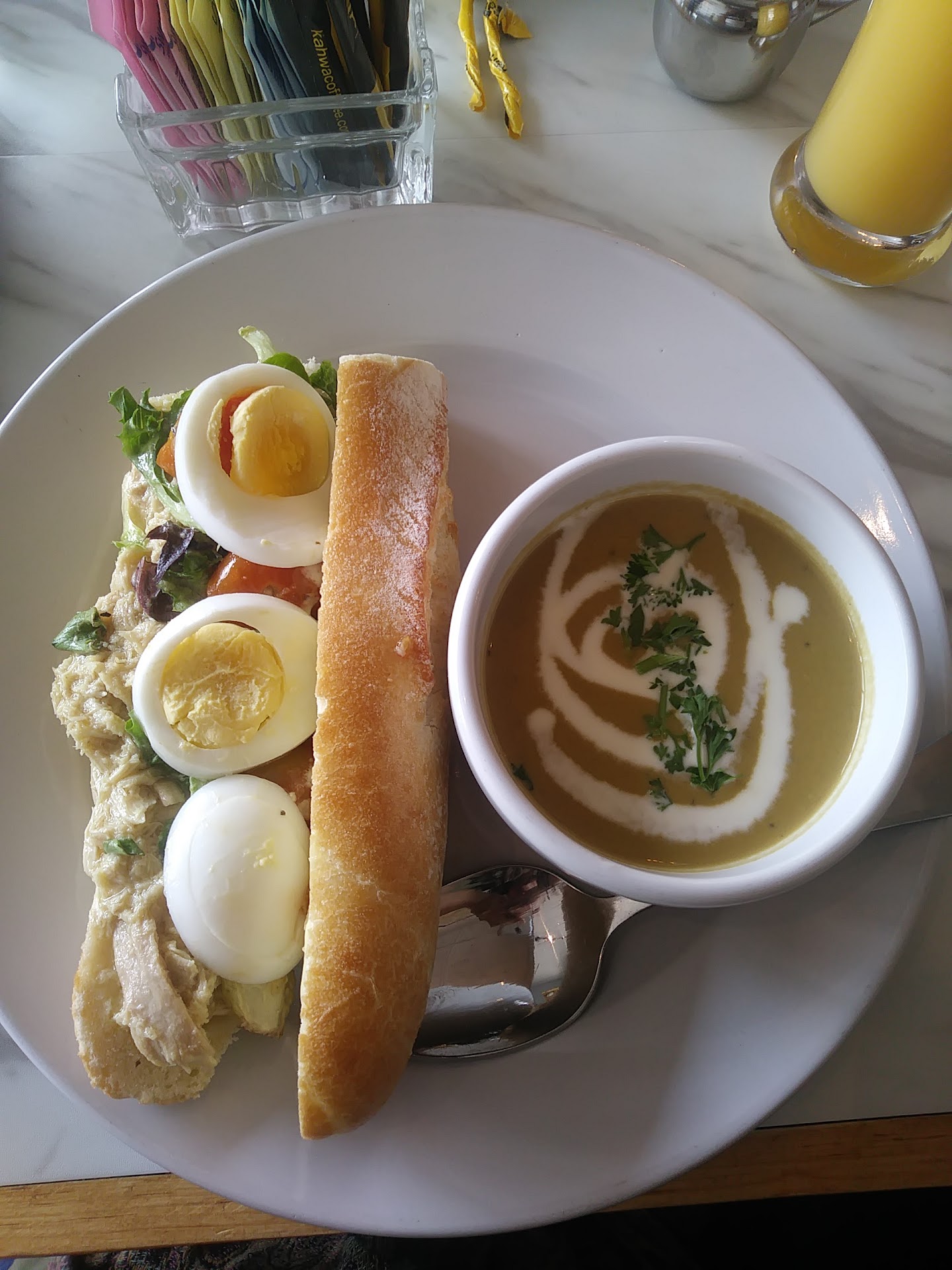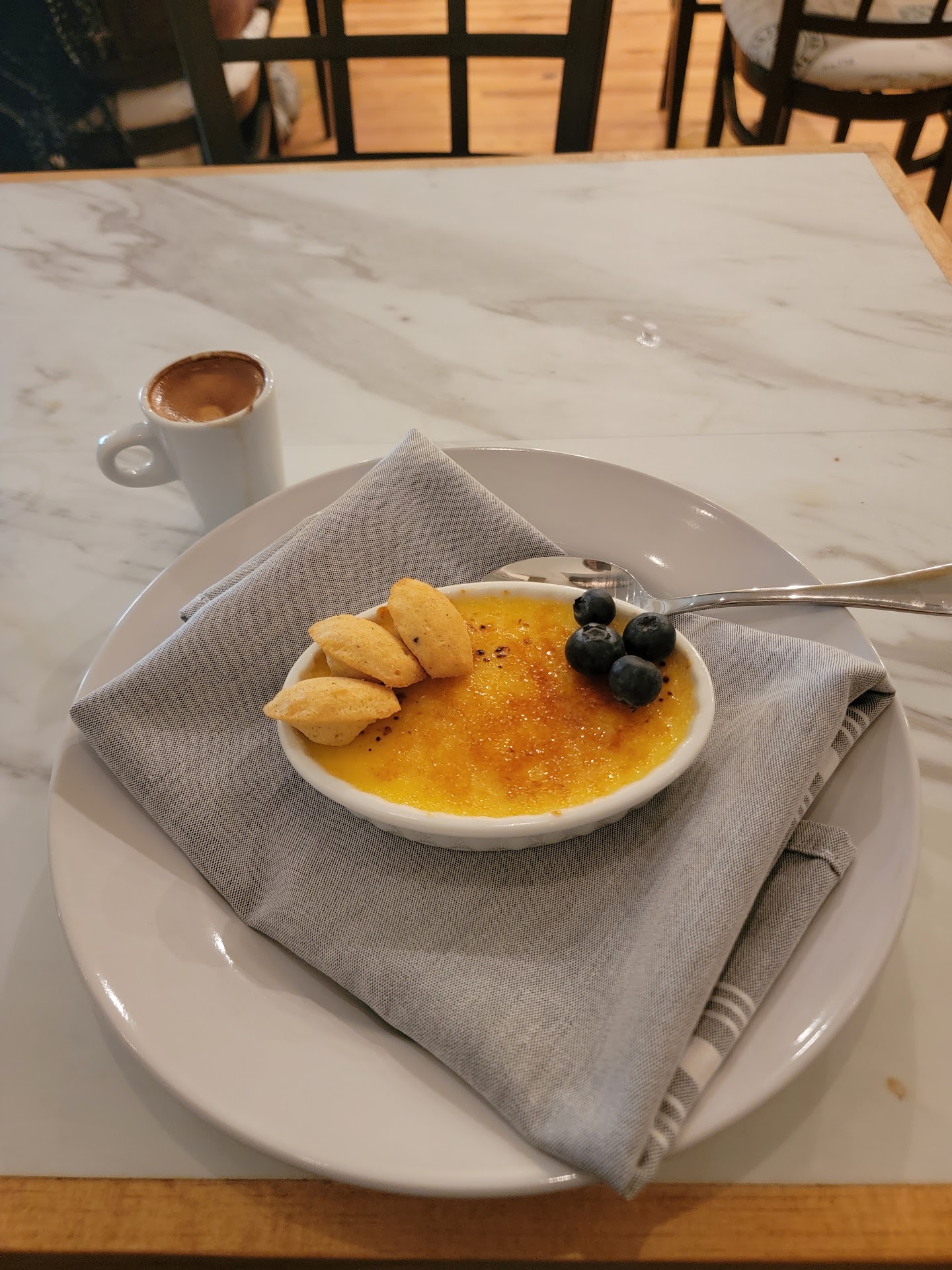 Read moreWe had a reservation and were given a table literally 1 inch away from another couple, so it was a dinner with random strangers. Someone stopped at the table close to 5 minutes after we sat down and provided waters. The waitress showed up probably another 2 minutes after that. The restaurant was not busy at this time. We placed our wine, soup and entree orders. Then the restaurant began to fill up. Over an hour after we ordered the food still was not delivered. Every table around us that came 20-30 minutes after we ordered were served and most had already eaten by the time that our food arrived. We had basically finished the entire bottle of wine by the time that the food arrived. I ordered the Boeuf Bourgignon Et Frites. She had the Coq Au Vin and we both had French Onion Soup to start. First, the good. The French Onion Soup was really good. Both of us liked it. The Coq Au Vin was much better than the Boeuf Bourgignon Et Frites. The "Boeuf" was basically a soup with a total of 4 chunks of beef (3-4 oz total of meat at most) and two carrot slices. The flavor was okay. Fortunately, there were a ton of French fries, so I didn't leave hungry, but for $28 for this entree I would have preferred more actual dinner and less fries. The room was very loud, the food (except the French Onion Soup) was just okay and the service wasn't great. In the close to two hours that we were in the restaurant no one ever refilled our water glasses. The waitress was personable, but it was unfortunate that we had to ask about why our dinner was taking so long and also never received a refill of water. The waitress offered a dessert for free due to the delay on dinner, which was appreciated but no manager or owner or anyone else stopped by. The dessert, "Le Lucy" was fairly good, so that was nice. I have been advised that they make really good pastries here and their brunch is good, but as my first time in, based upon the atmosphere (loud), service (lackluster) and food (just okay), I probably would not come back here for dinner. For two people with the above issues our check (pre-tip) was over $140 and when spending that kind of money, I would like for the food, service, etc. to be better.