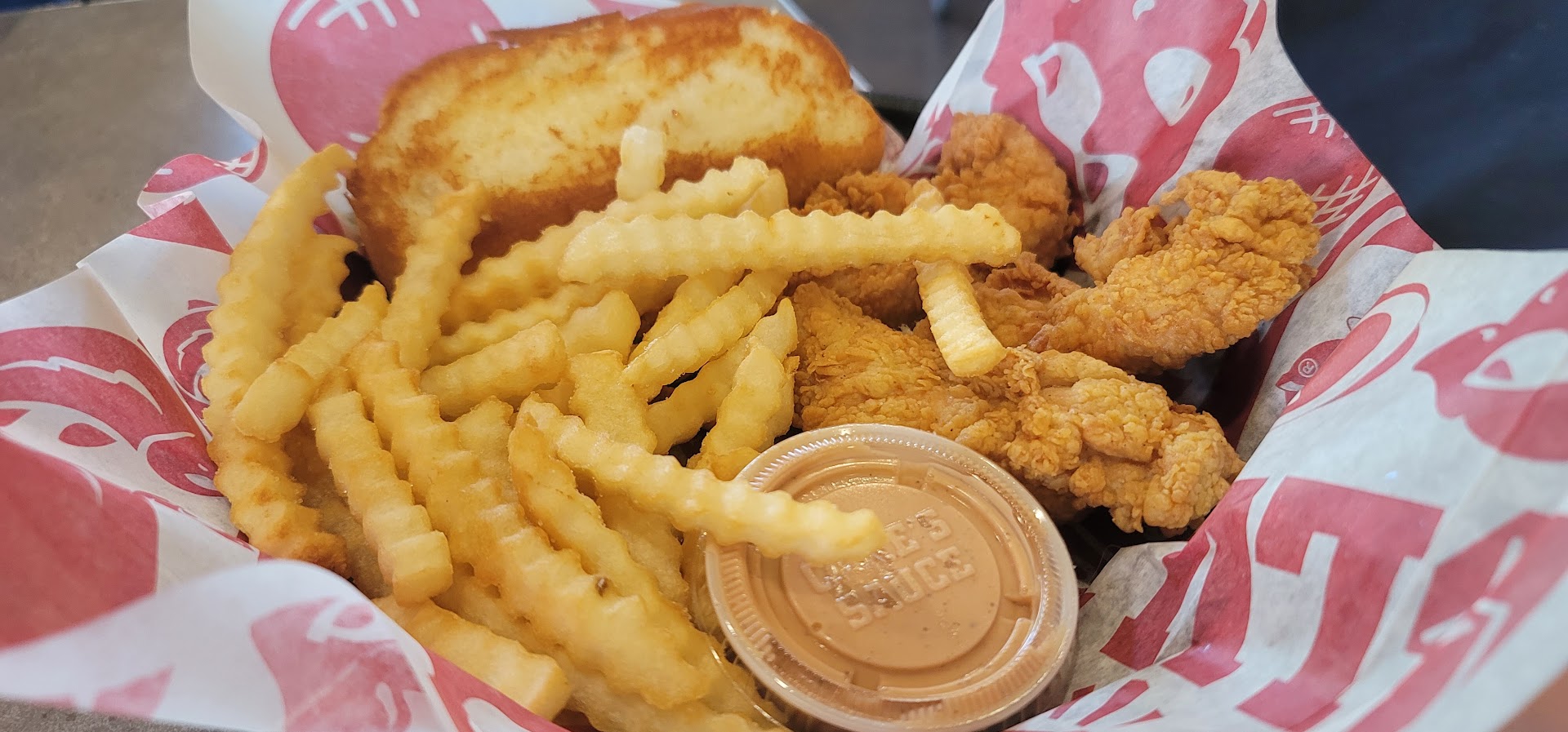 I bought two "Caniac" combos today while rushing between appointments with kids. I opted for only fries because no one likes coleslaw that was present. (I also ordered a 3-finger combo, an extra order of fries, and an extra lemonade to cover everyone.) The Caniac combos are supposed to come with 6 tenders, two sides, bread, and two sauces. Each of OURS came with 4 tenders, not 6. I'm not sure if the fries were in proper proportions, both sauces and the slice of bread were present. Everything else seemed to be in order.