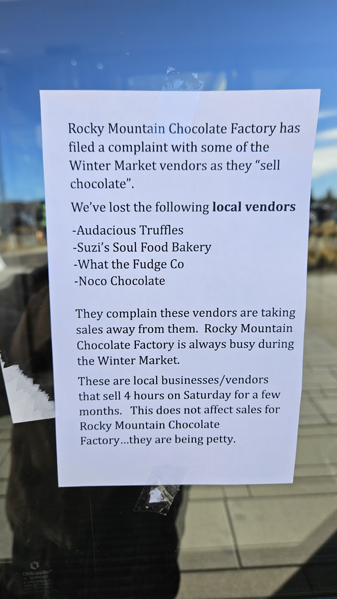 Ā Ā Ā Read moreWhile the chocolate at this shop was decent (I got the Dubai chocolate bar and the chocolate covered potato chips which were serviceable and had a good crunch) I was extremely disappointed to learn afterward about their business practices. Filing complaints to push out small local vendors over minor competition at a seasonal market is beyond petty. Rather than supporting the community, they chose to stifle it. In my opinion, Fort Collins is a big enough city for multiple chocolate vendors and a company big enough to be in DIA shouldn't be worried about small local businesses! As a visitor from out of town, this was by far my least favorite experience from my trip in retrospect, due to their egregious attacks on smaller local businesses. I can't recommend this place and encourage others to think twice before supporting a business with such questionable ethics. This kind of behavior leaves a truly bad taste in my mouth, far worse than any subpar...