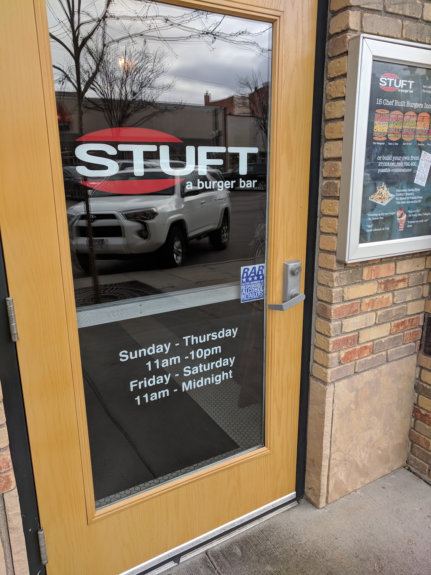 Read moreVery disappointed: I told our friends that this is a great place and the food is awesome. This was based on the Windsor,CO location which closed around 2018/2019. The Windsor Location was always busy,food excellent,servers very friendly (especially Howard). Each booth had a small TV where you could watch whatever. The Fort Collins location okay but it was way older than the Windsor location and no TVs at the booths. So the food: We had a party of 8 My wife and I ordered the Bison Burger as we've done in the past in Windsor. When we got our food EVERYTHING WAS COLD!!!!!. I told our waitress Amy and see said no problem she would get a brand new order for us. Our friend ordered a burger with grilled onions and it had very very little onions. We told Amy and she brought a cup full of grilled onions. When we received our new warmed bision burger it was very warm like it should have been BUT the bison (both) had a funky taste to it, hard to explain unless you tasted it yourself. We talked to Amy why they closed down the Windsor location and one of the reasons was they rebranded it to another restaurant called the Lonesome Dove I believe but it failed as it was during the pandemic and the Windsor STUFTS location was not busy. BullFunkey!!! We went to the Windsor location every 4-6 weeks and every time is was busy, We had to wait at the bar a few times which was no problem.