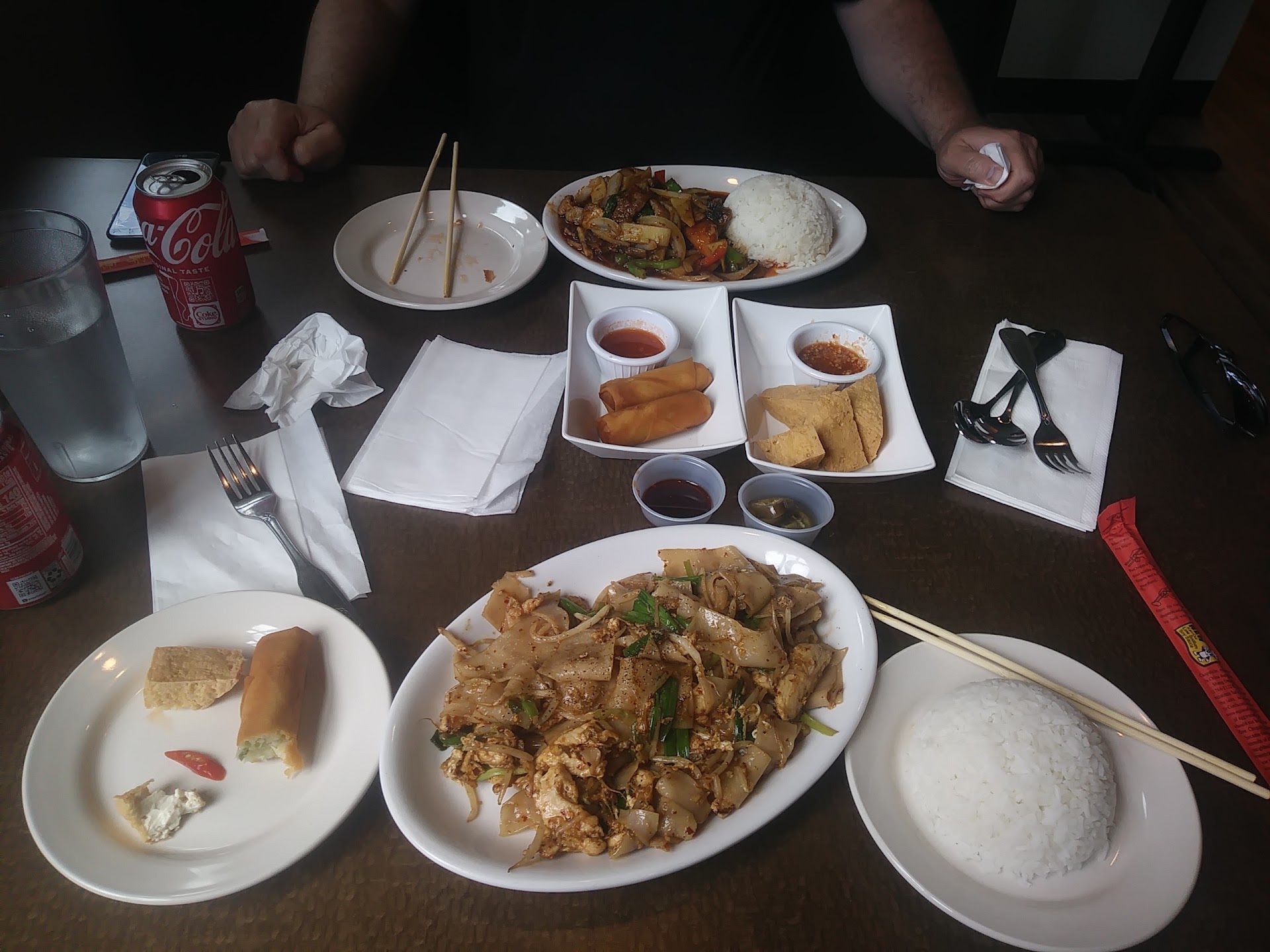 How about Pad Thai -- decent, although the noodles are soggy and limp, I suspect since it's been sitting around for a while. Further confirmation is the lime is a warm, disintegrated mess, but adds the necessary flavor.