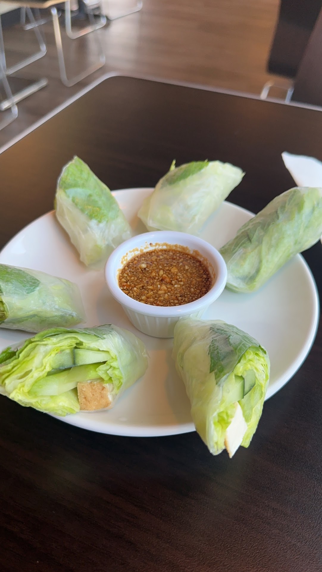 The service today was great, too; the person who helped us answered all our questions, and she made herself available to help us without "hovering" or rushing us. We also liked the setting; from the outside, the restaurant is one of many in a Campus West strip mall, but from the inside, you feel transported: the dining area incorporates modern design in a way that doesn't feel cold, because of the floor-to-ceiling colorful murals. Today, there was also Thai music playing in the background (at a totally unobtrusive volume, so it added to the atmosphere but didn't interfere with conversation).