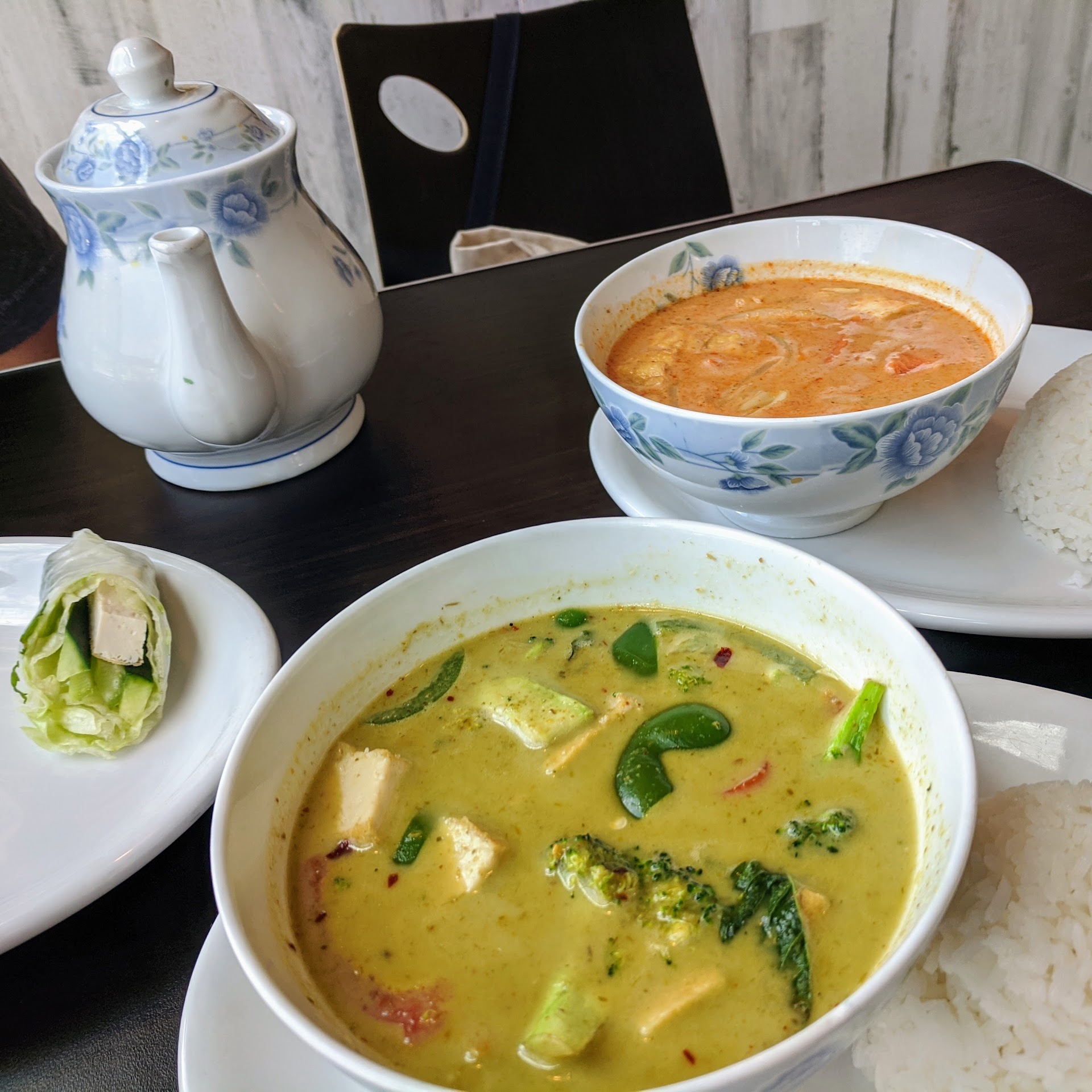 Today we started with the fresh rolls (a wonderfully cooling dish with fresh mint -- perfect for today's hot weather!) and a pot of jasmine tea. We then each enjoyed a curry with tofu, and both were great (see photo -- mussaman curry in the back, green curry in the front). Super flavorful, and each dish met our respective preferences: She wanted something mild, and it came that way, mild but still very flavorful, whereas I wanted something with a bit of a spice kick, and my green curry was spiced to perfection.