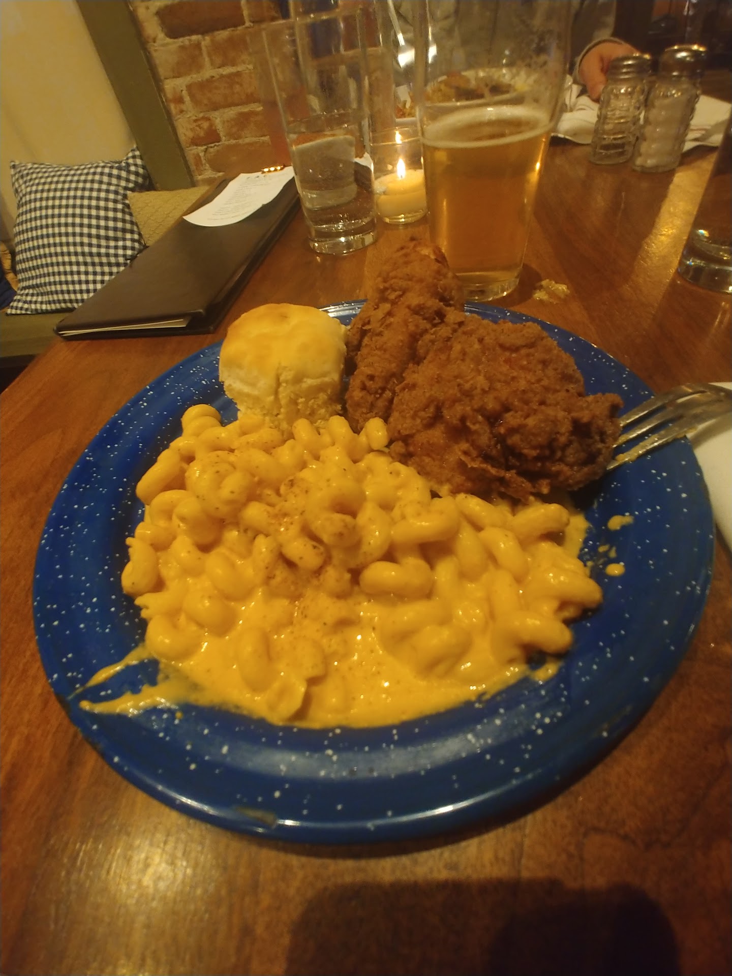 Food review: My wife ordered the Fried Chicken (which came highly recommended by our neighbor). For $20 I expected at least 1/2 a chicken. I even asked the waitress if it was a lot of food so I could eat what my wife wouldn't finish, and I could order something different. Instead, she was presented with what appeared to me to be a child's plate, although it wasn't. A small (very small) leg and a small thigh (very small), a small spoonful of grits, and a biscuit... my wife did say the biscuit was good!