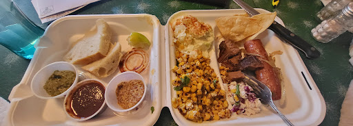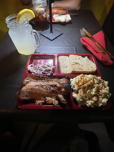 Read moreThey were very busy and running out of popular food items, but the young woman working was super polite and professional and worked quickly! We took our food to go, and it was delicious! We got sausage and brisket. Tender and delicious brisket and savory smoked sausage with grilled onions. I loved the classic potato salad...nothing weird in it, just great potato salad LOL The roasted corn was amazing...Elotè or buttered, I got elotè...spicy and so good. The bread was slices of crusty bread with a very tender crumb. So delicious! Plates come with slaw, spicy, got to be house made, BBQ sauce, mustard (no ordinary mustard), and green salsa. The front room, where you order/wait, has cozy chairs, so you can relax while you're waiting for your turn to order. There are 3 picnic tables outside that are covered, so you can eat out there too. The dining room lighting gives it an intimate vibe. We took our food home, but we'll be back to get the...