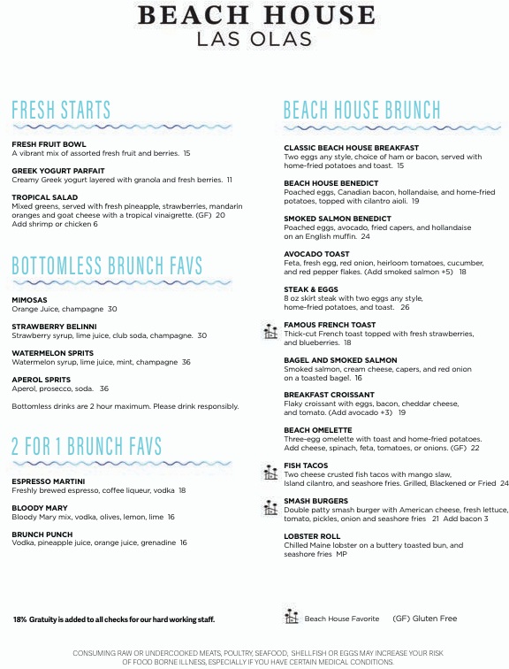 My group of three ordered Classic Beach House Breakfasts ($15 each), and two of us opted for the "2 for 1" Brunch Faves Drinks "Brunch Punch", which were clearly listed on the menu as $16 per person. That brought our expected total to $77 before tax. With tax ($82.39) and the automatic 18% gratuity (which was odd, considering we were a small party), the total should have been $97.39.