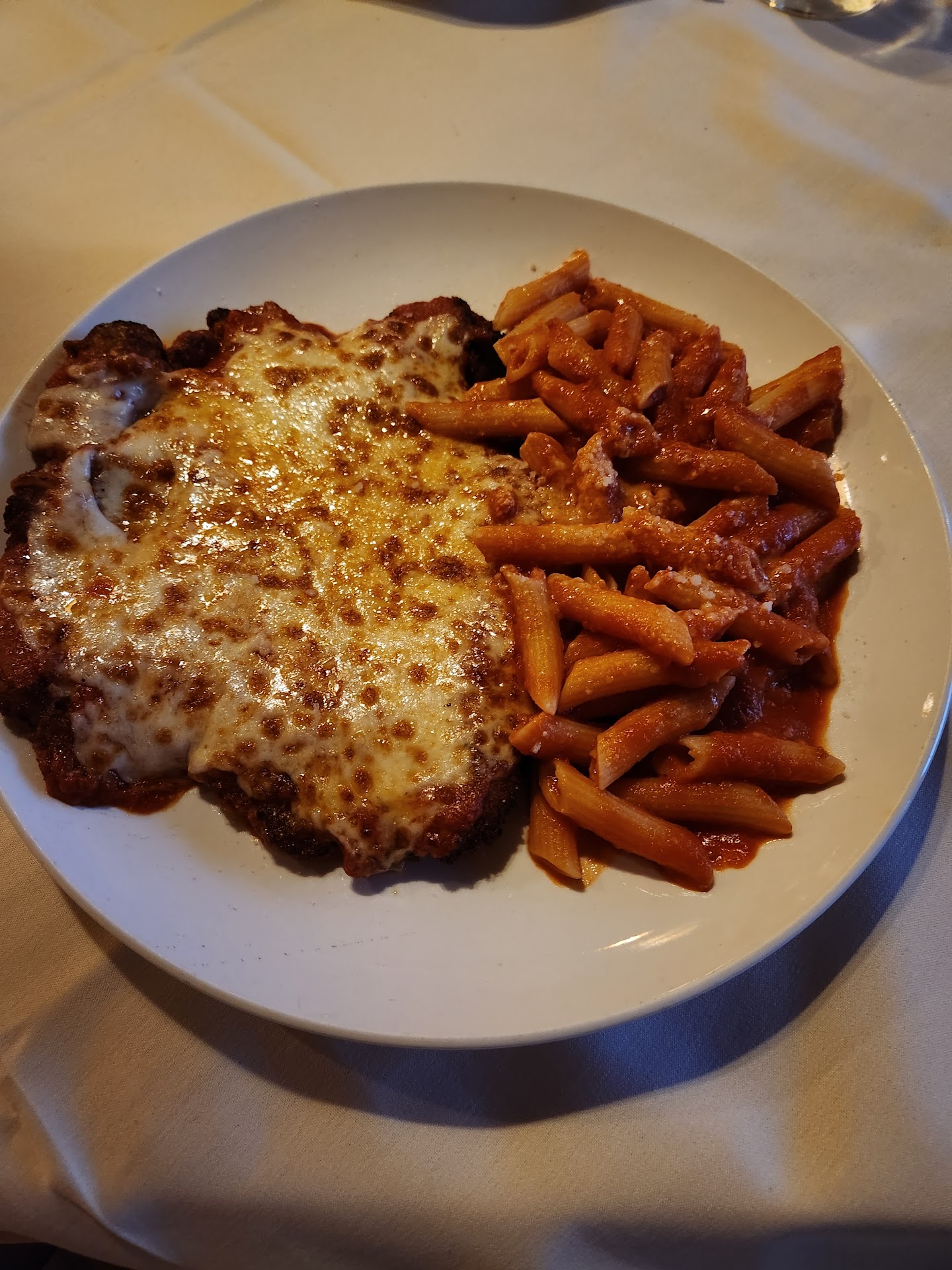 My wife and I both ordered the chicken parm entree which is accompanied with penne pasta. My ricotta obsessed wife asked for some on the side and Casa Calabria did not charge an additional fee. The little things go a long way with us and it's nice knowing this establishment isn't looking to nickle and dime. Chicken Parm dinners were excellent and could feed a small village. The monsoon of a cutlet was ridiculously crispy, and the cheese was golden brown.
