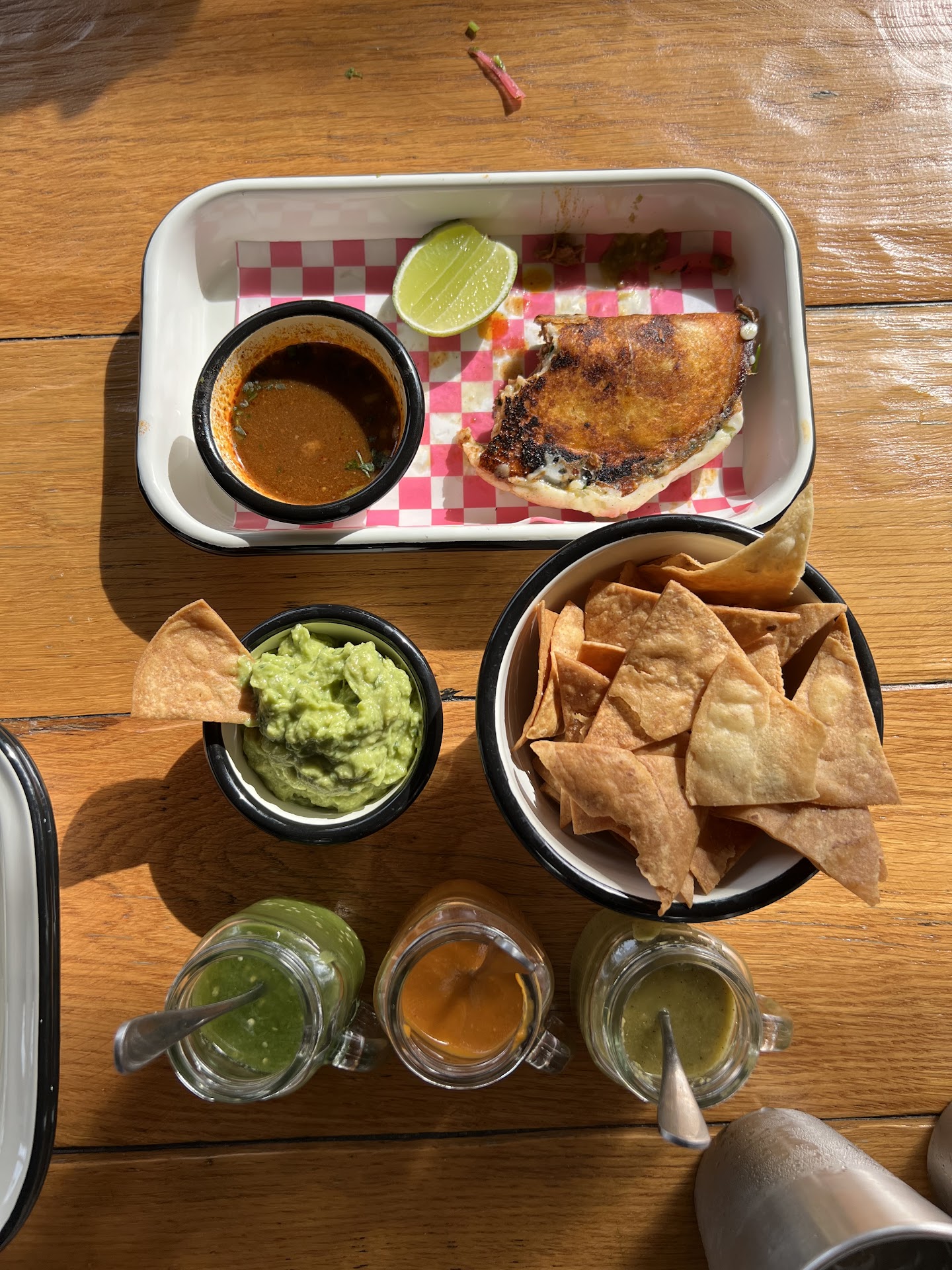 We had the quesadilla birria $7, pulled pork with onion $5, guacamole $4, served with chips and an assortment of sauces. The place is very open and spacious, with indoor and outdoor seating, great for large groups. Thereās a large projector for watching games, two arcade games and a fully stocked bar. There are margarita and beers deals, not sure if there is a taco Tuesday promotion (most likely). You can order online or with...