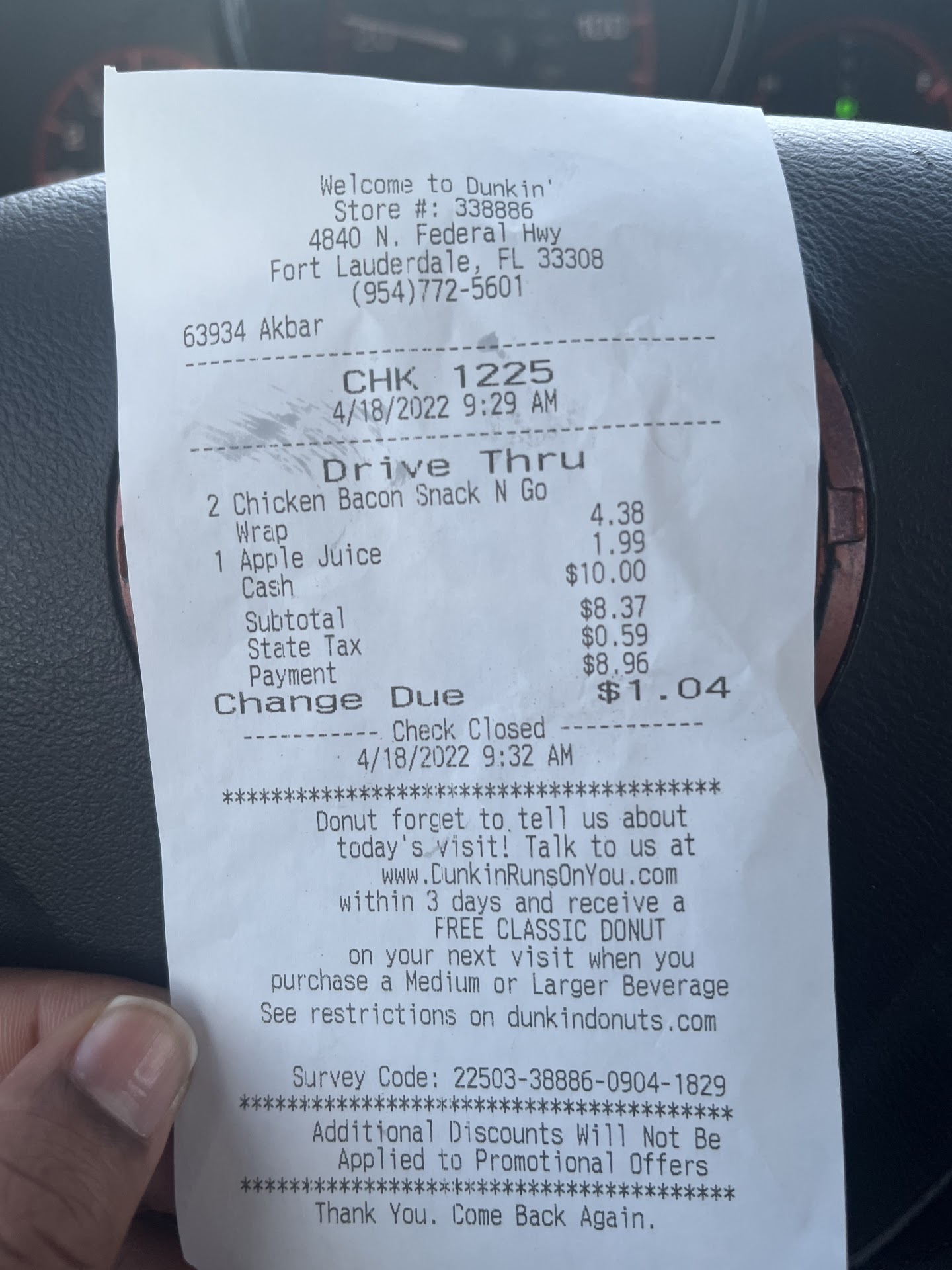 Read moreThis dunkin location is not that good. Food is mediocre at best and is usually stale/cold, coffee tastes weird sometimes, and the customer service really is lacking. I read other reviews about the flies and it is true. Every time I go in there I see it. I have seen the backdoor propped open on multiple occasions so that is not surprising. I've also seen equipment left outside the backdoor unattended (usually the doughnut racks). Once I saw one out back and it was being swarmed by birds I guess eating all the crumbs. I was standing at the counter once and watched an employee pour half a cup of regular coffee for my order which was decaf, looked up, noticed that I saw it, switched to the decaf and then served it to me. Didn't bother to say anything or offer to replace it. All and all this has to be one of the worst dunkin locations I have been to and will not be returning. I'm done wasting money throwing food away. I don't like writing negative reviews but this location has let me down so many times and really is...