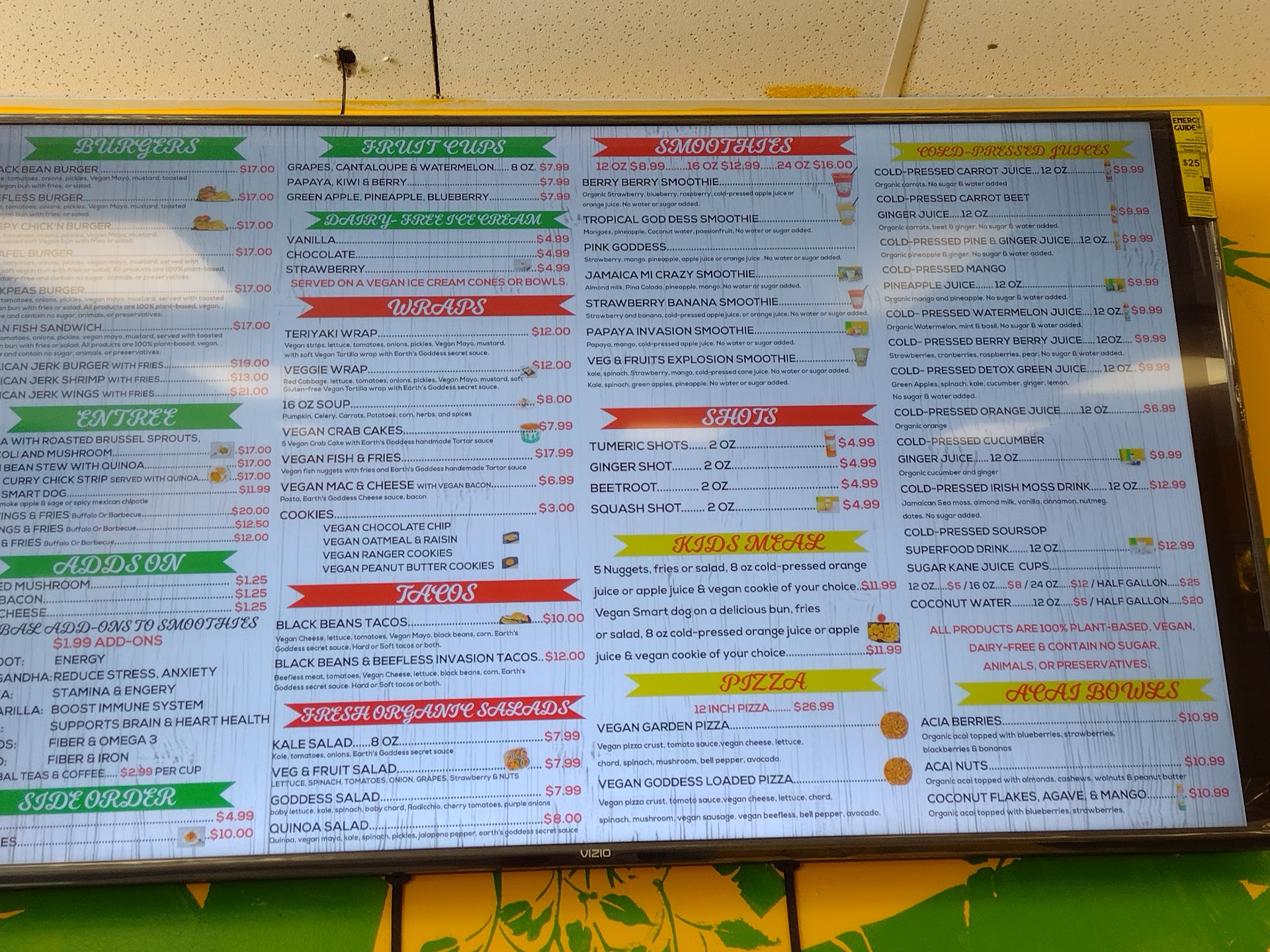 1- They have multiple selections of smoothies, juices, food, wraps, sides, soups you name it. I ordered the Jamaican crazy and my sisters ordered the vegetable/fruit smoothie and a compressed Irish moss. Yum Yum allll depending on preference. I actually drank my whole drink while in the shop. I attached the menu sorry for how small it is.