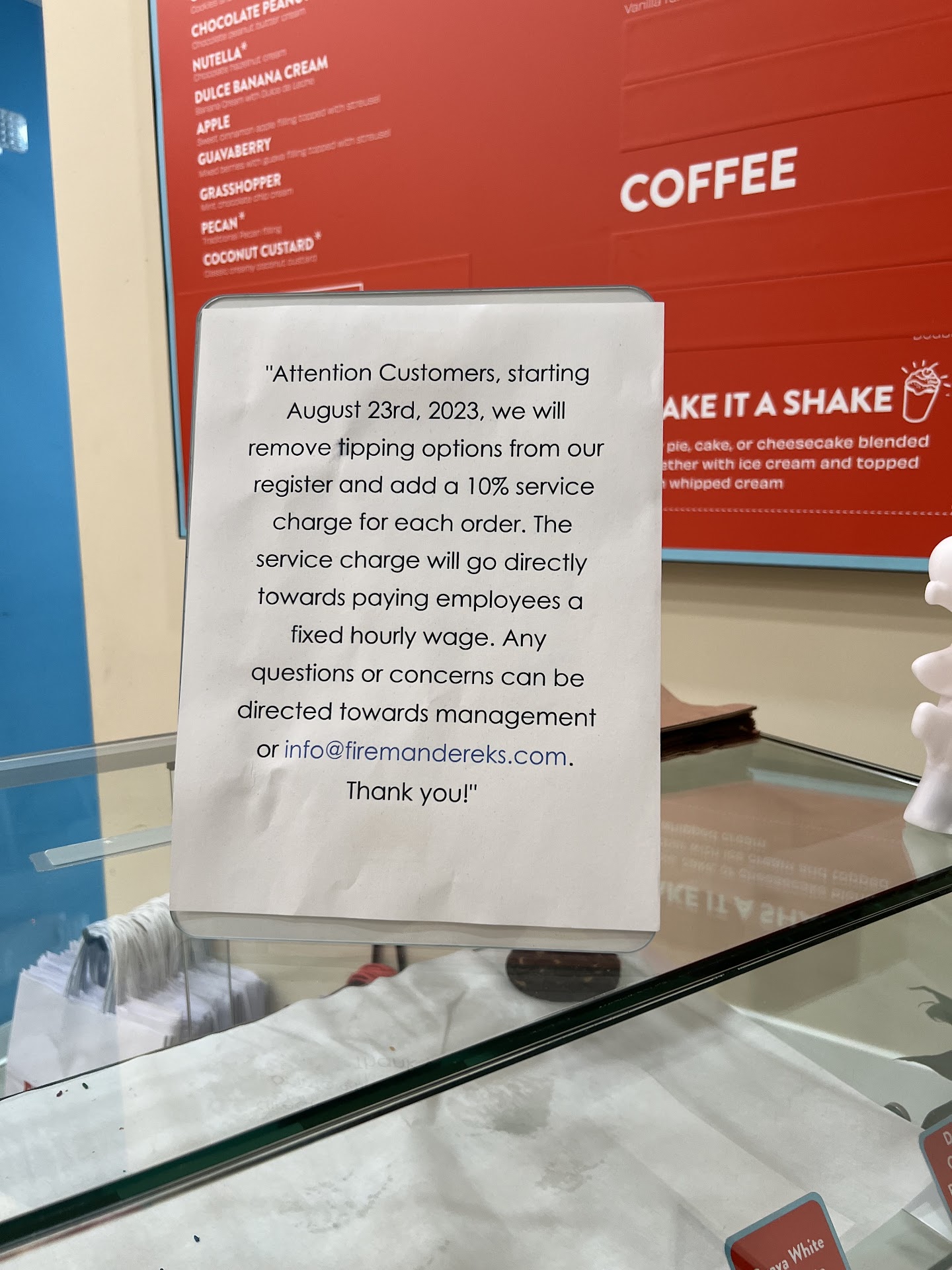 You don’t see the grocery store tacking on a “service charge” for the slice of cake or pie you buy there; nor do they offer you a tip line for the labor of ringing up your pie / cake.
