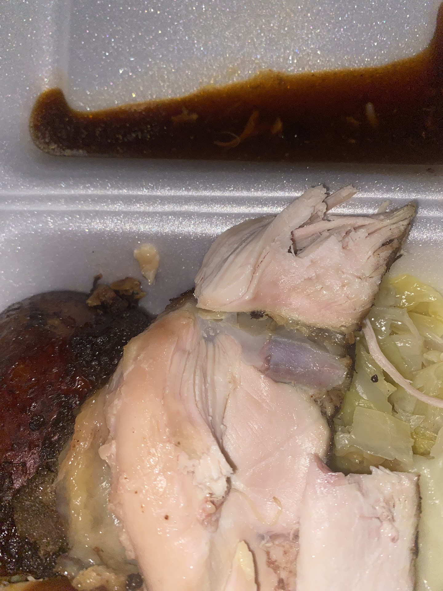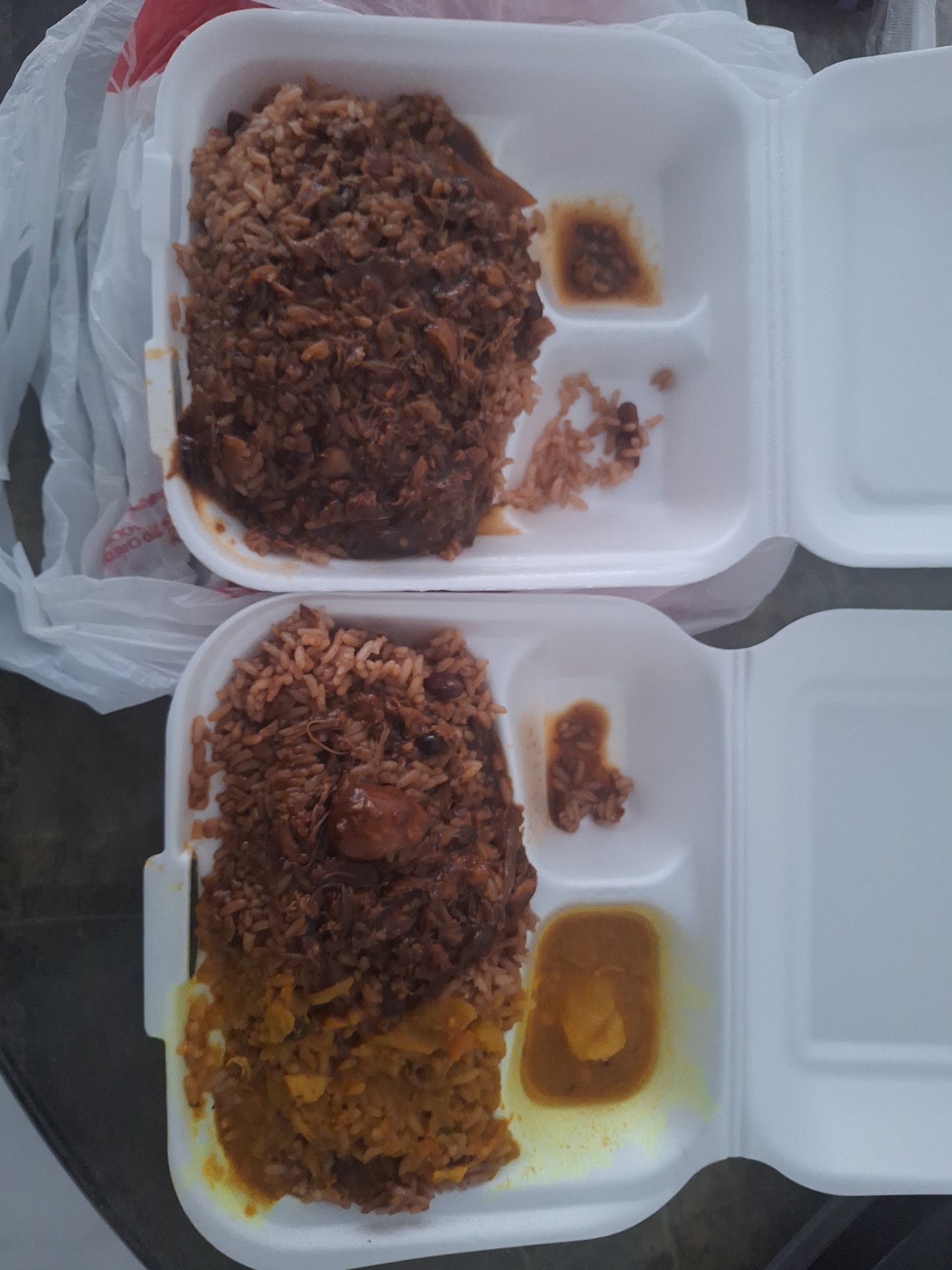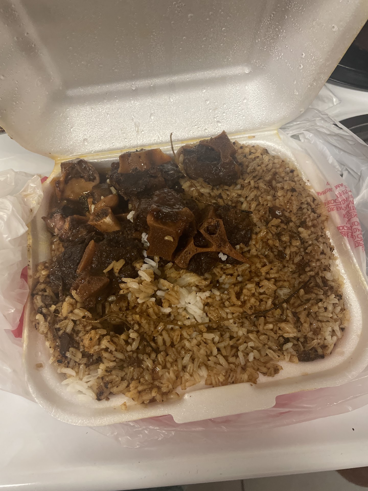 Brown stew chicken and white rice. When they say don’t come to this place don’t! Food looks great but chicken was hard in a lot of places and actually taste like a bunch of ketchup. Once I got up and looked at the food in the serving side it looked pretty old as if it had been sitting a while.