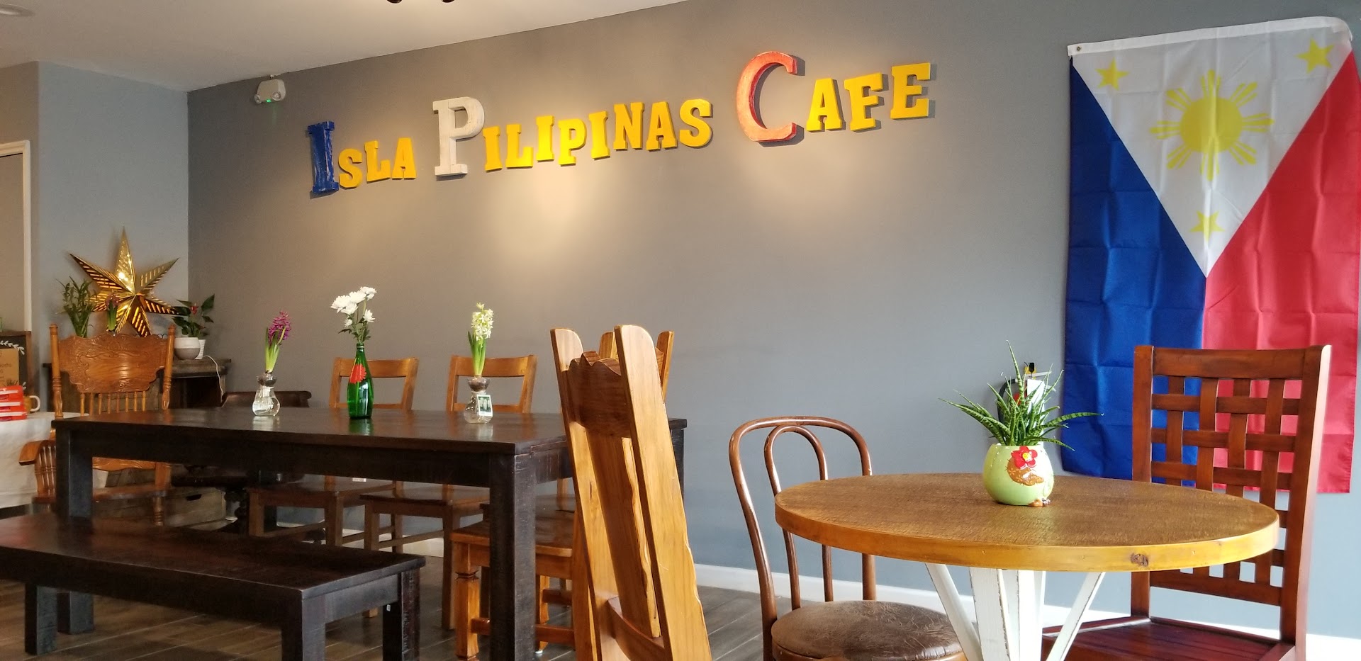 Read moreVisiting Isla Pilipinas Cafe is like going to a friend's house after an intense game of tag or half-court basketball on the streets. The furniture is a pleasing, eclectic mish-mash of tables and chairs you'd find in someone's house which makes the ambiance homey yet classy. Real flowers and plants on the tables. The people are very friendly and engaging but not annoyingly so. We came pretty early for dinner so there was no wait. Monica, one of the co-owners, will greet and seat you. Edgar, the head chef, also came out to chat. The other chef, Jad, proudly served the sisig (chopped pork bits) on a sizzling plate with a warning about how hot it was. Found out he was also Monica's son, so it's quite a family affair. The food itself is authentically Filipino, with Knorr seasoning on the side upon request. It's buffet for lunch at $13.99 and à la carte for dinner with a good affordable price range. The dishes were pretty and made a unique collection of interesting place settings. The food were plated well, and very delicious. Some of the food or desserts may not be available so make sure to ask. One of us was craving for bibingka (rice cake baked over coals normally served around Christmas) but they were out. Had cassava cake instead. There was a wall with lettering that asked, "Taga Saan Ka (where are you from)" and of course we posed against it. Husband (white with upstate NY upbringing) thought fleetingly of giving the proprietor a hug with a "thanks, Tita (Auntie)!" since we really enjoyed our stay in this cute restaurant. Took many pictures of the place and menu -...