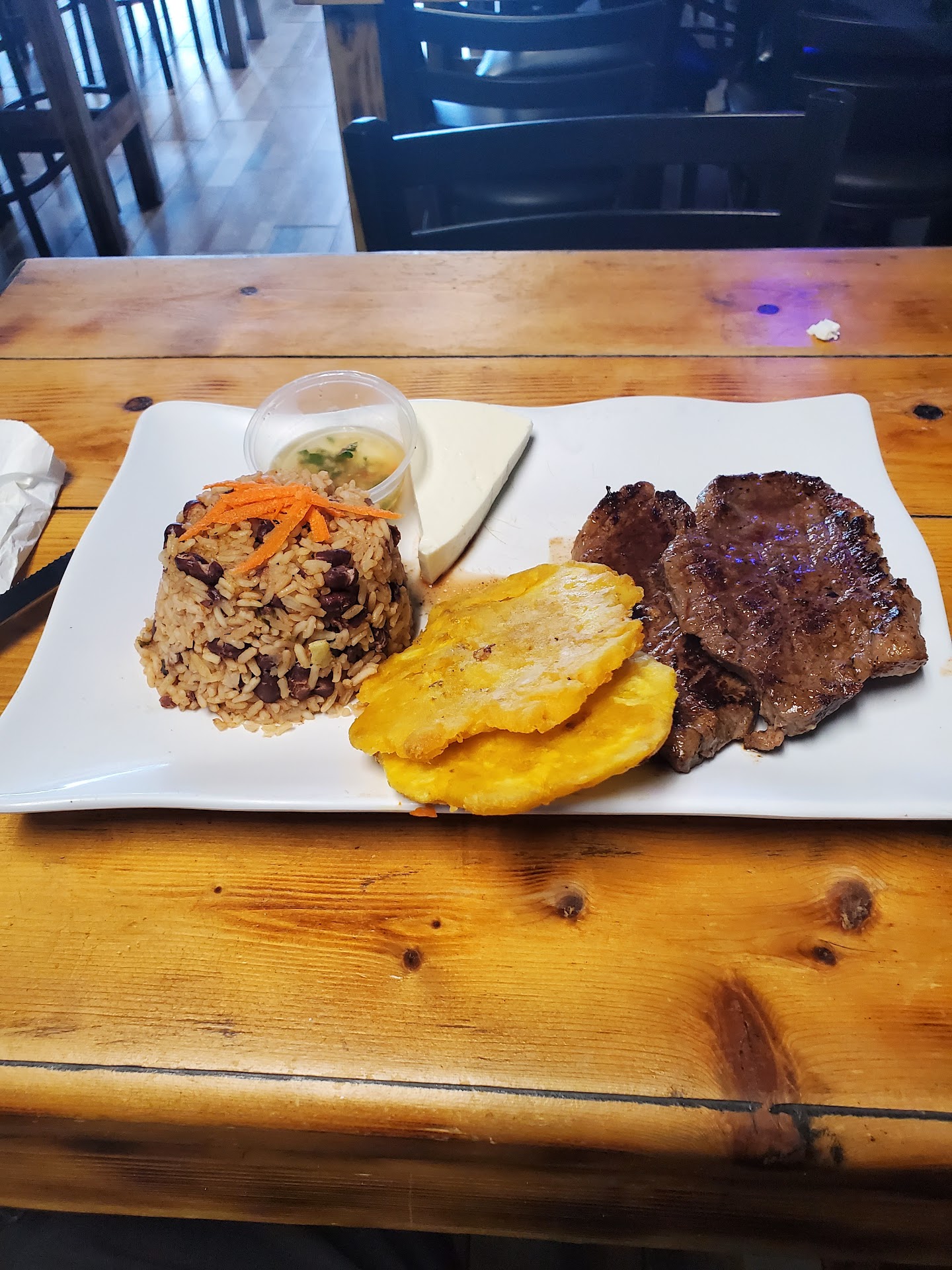 We kicked things off with a glass of wine and a refreshing horchata, which were perfect complements to the vibrant Latin flavors ahead. The fries with cilantro sauce were addictively good: crispy, golden, and bursting with fresh flavor. The carne asada was tender and juicy, served with sweet plantain chips and a crisp salad that tied everything together beautifully. The seafood platter was another standout with generous portions of shrimp, fish, and calamari, seasoned just right and cooked to perfection.