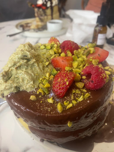 I ordered the Dubai Pancake, which was visually beautiful but underwhelming in flavor balance. The pistachio filling was a highlight, but there was far too little of it, only enough to lightly cover the top layer of the pancake on top. If the filling had been layered between each pancake, it would have transformed the entire dish.