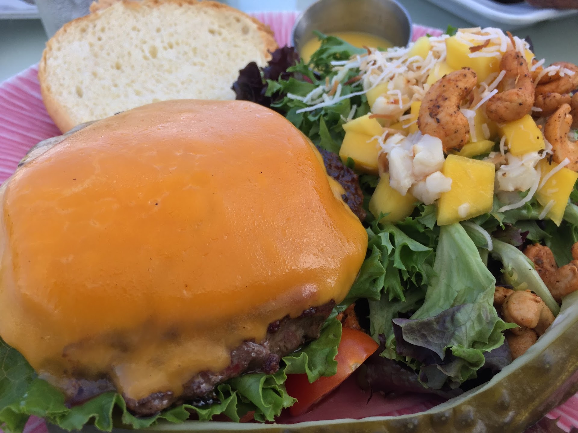 I had the burger and my husband ordered a steak. We love seafood so it seemed odd to us that neither of us really ordered any today, considering we were eating on the water. I have submitted photos of both dishes. The salads that accompanied our meals were phenomenal.