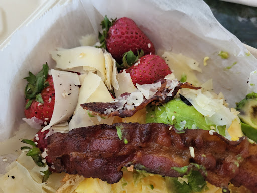 Today I ordered two iced coffees, and the most beautiful egg croissant, appropriately called the Bella. A fluffy, super fresh croissant, scrambled eggs, avocado, parmesan flakes, sprinkled with everything seasoning, topped with perfectly crisped bacon and side of fresh strawberries. It was heavenly.