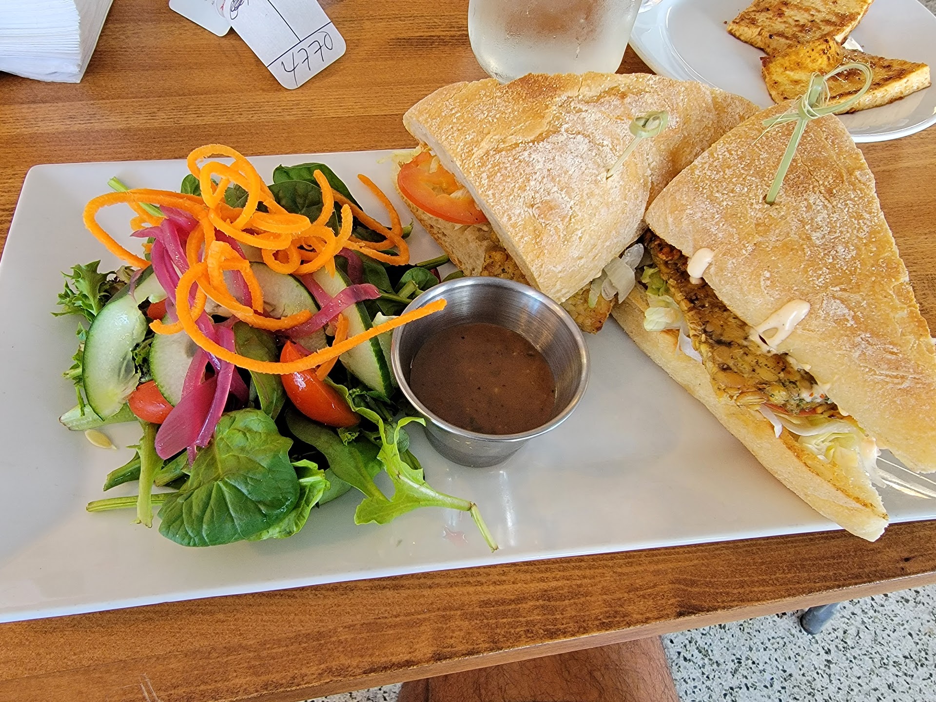 I ordered a TLT sandwich (Tempeh Lettuce Tomatoes) and it was delicious. Nice big slab of tempeh, not the small strips you get everywhere else. See pics for portion. Tasty, but you can tell it's fresh. I got the salad as the side, and it was small, but still very good. The vinaigrette dressing was incredible, I ended up using it as a bit of a dip for the sandwiche.