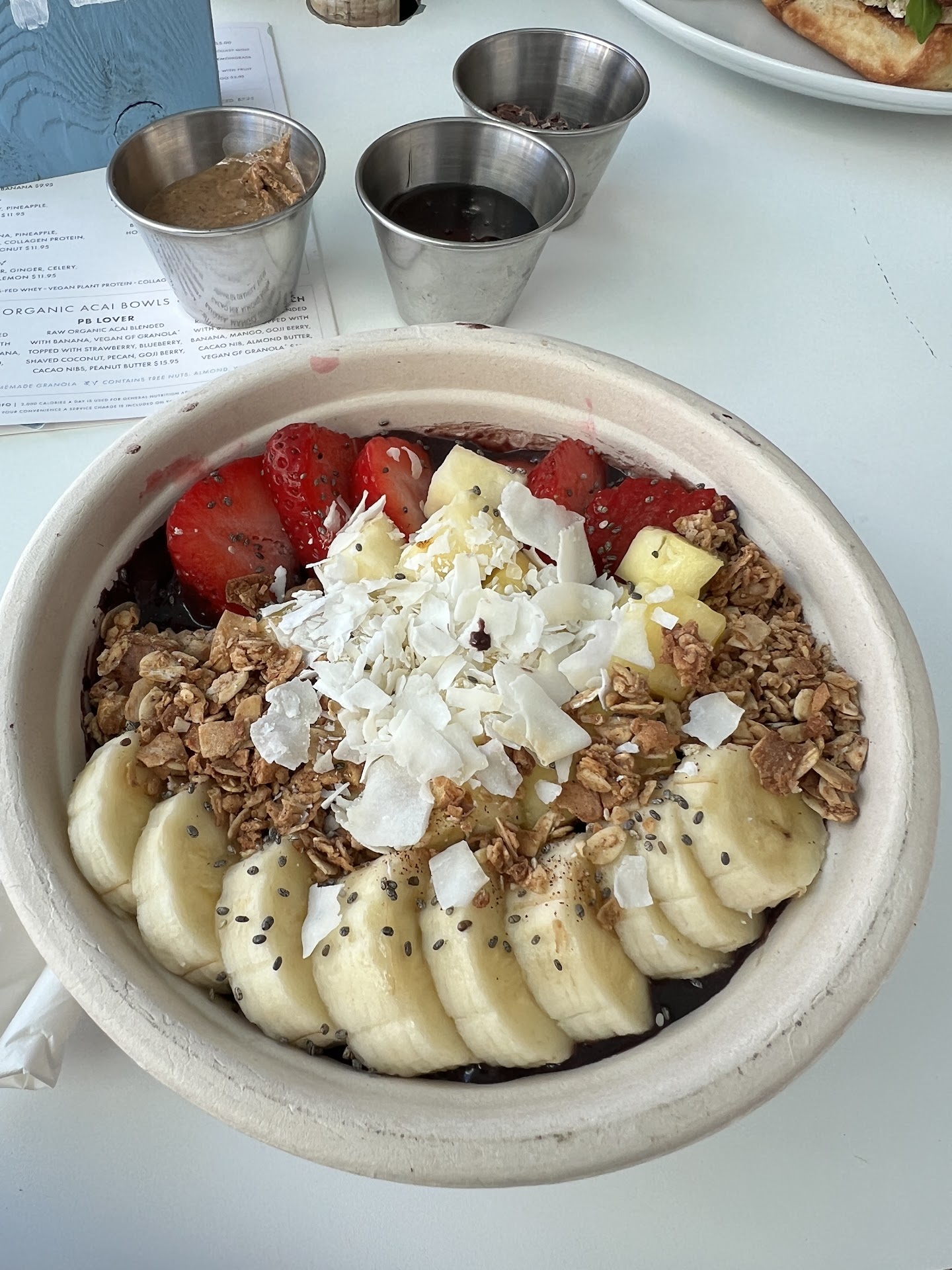 Disappointing. I’ve had many açaí bowls from different establishments. Although fruits seemed fresh, the taste was not there. Even then, it would have been ok (probably would have given 4 stars for food quality) but what was really frustrating is that the extra toppings (honey, cacao nibs and almond butter) I ordered came on the side. The açaí blend was watery which is a big no no for açaí bowls. They’re suppose to have a thick and creamy consistency. Seems like they diluted it with too much water. Honey definitely didn’t taste raw and un-filtered fresh from a farm; it was more of a commercialized filtered honey. This was surely to make a chaotic bowl if I had to place extra toppings on top. I paid $22 for a bowl that wasn’t fully prepared to eat. Overpriced and underwhelming. Seems like they just put things together to make it sound, “healthy” ir order to spike the price.