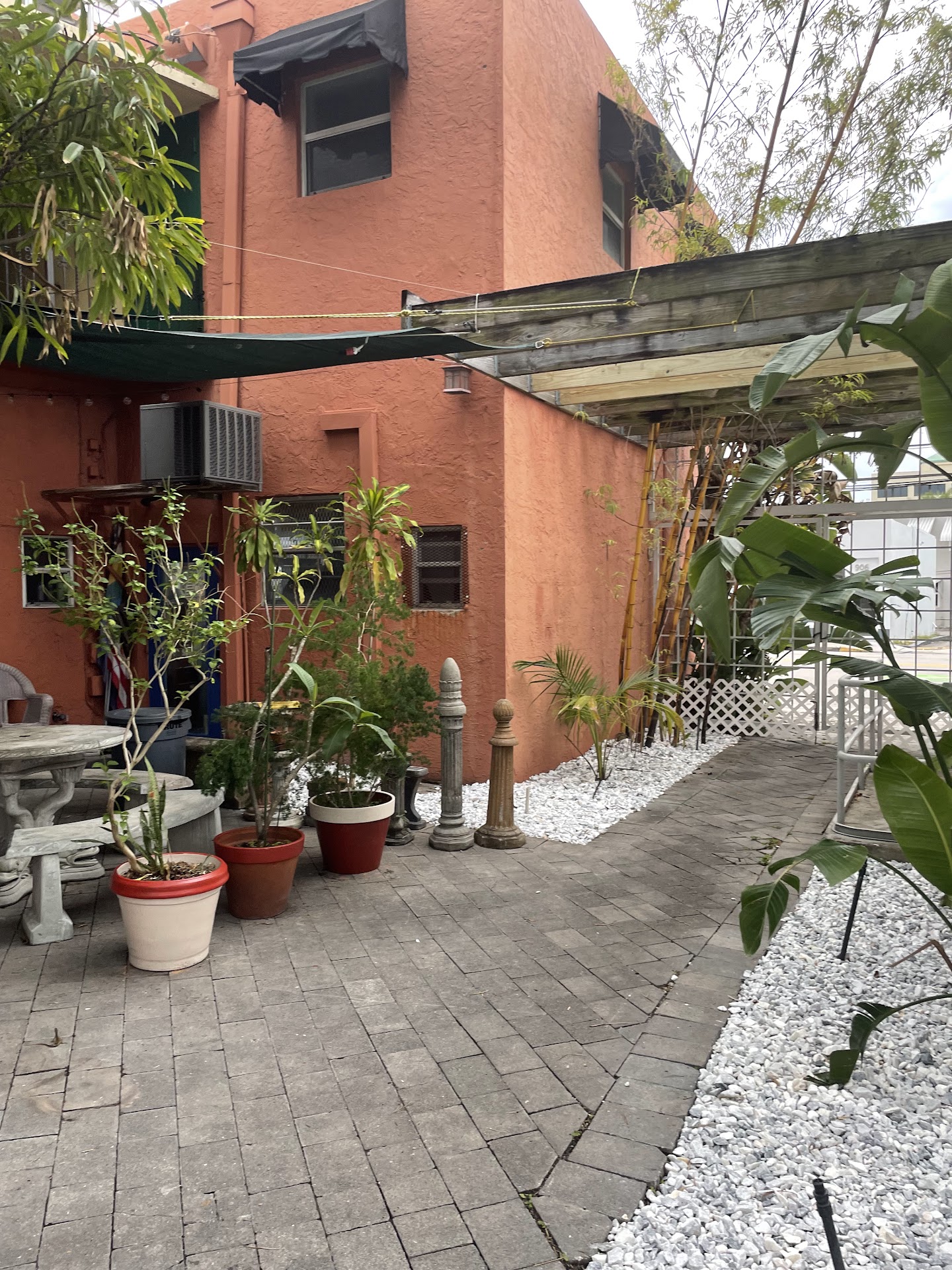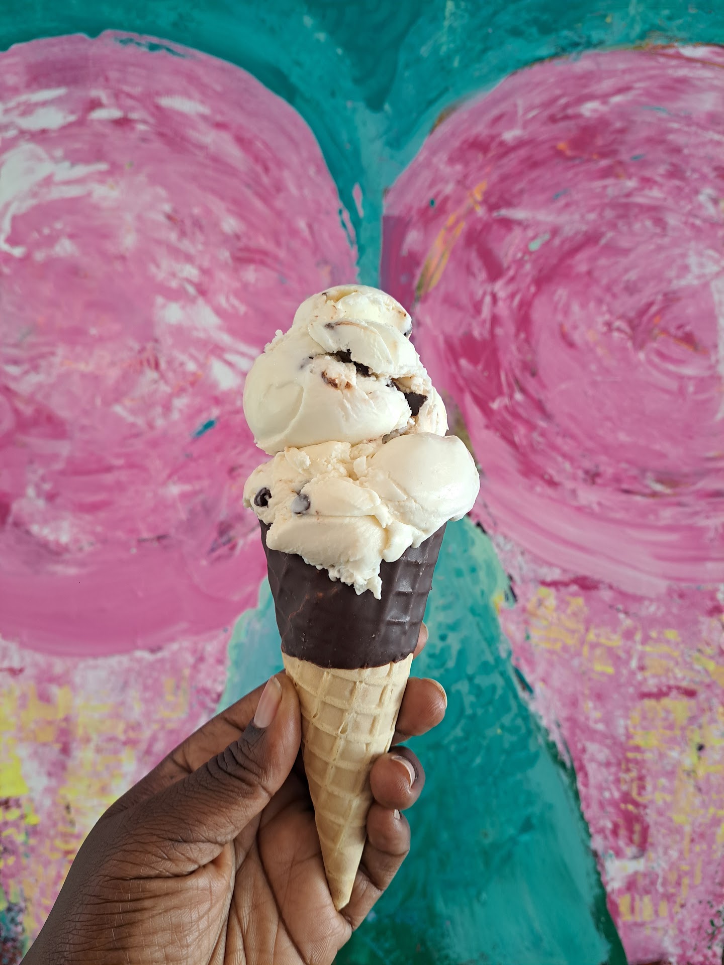 You can eat your frozen treat out back in their courtyard that is the Victoria Park Flower Garden Center. The walls are lined with art by multimedia artist Sue Thomas and it a very relaxing place to sit under their shade canopy. There is even a cornhole game.