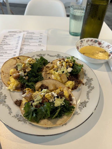 The kitchen’s reach is generally assured, though not without flaws. A breakfast plate of eggs and chicken sausage faltered on the latter: the sausage arrived overcooked and dry, resistant even to the knife. By contrast, another plate, with scrambled eggs layered onto a perfectly toasted bagel, found its harmony in a swipe of jam alongside the eggs. The lyonnaise salad was perhaps the most compelling: the pork belly, suculento, tied together crisp lettuce and tender egg with richness and restraint. Not everything arrived at its peak — the avocado on the side was under-ripe, a misstep that broke the rhythm.
