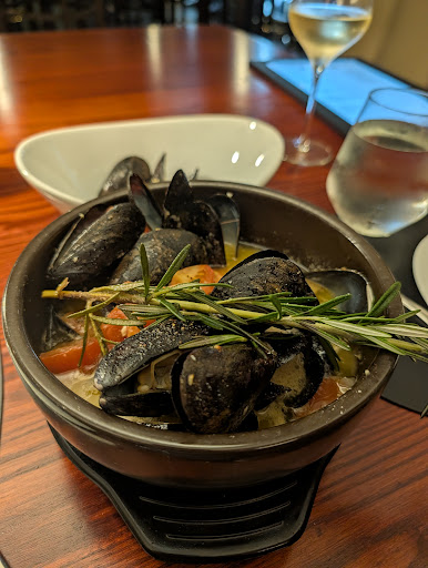We ordered mussels which were literally boiling and thus disappointing as we had to wait a long time to eat them and both burned our mouths on the egregiously hot store bought tomato chunks in the broth. The mussels and broth had very little seasoning and were in desperate need of salt. On top of this, at least half the ones we tried were gritty and unedible. We would have loved to bring this to our waiter's attention but he was generally MIA. When he finally did check in about the mussels he did not wait around for the answer as he promptly left without listening.