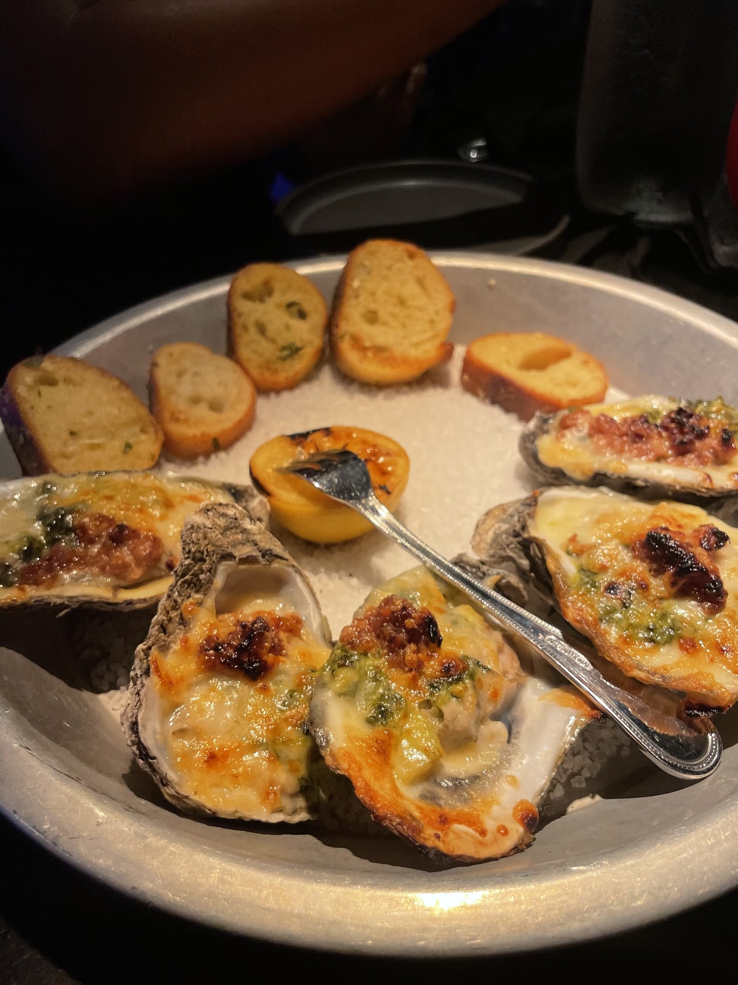 Now, our food did come out very very fast as did our drinks. For drinks I ordered the Black Magic Lemonade, and my friends ordered the Hurricane. All of these drinks were AMAZING and looked great! For appetizers, we did a whole bunch,just to share- gator bites, fried oysters, oysters rockefeller, stuffed mac and cheese, and the barbecue shrimp. I have to say the only real tasty item was the oysters. Also, we did have to wait a while for sharing plates and the table was really small for a party of four ordering a lot, so be mindful.
