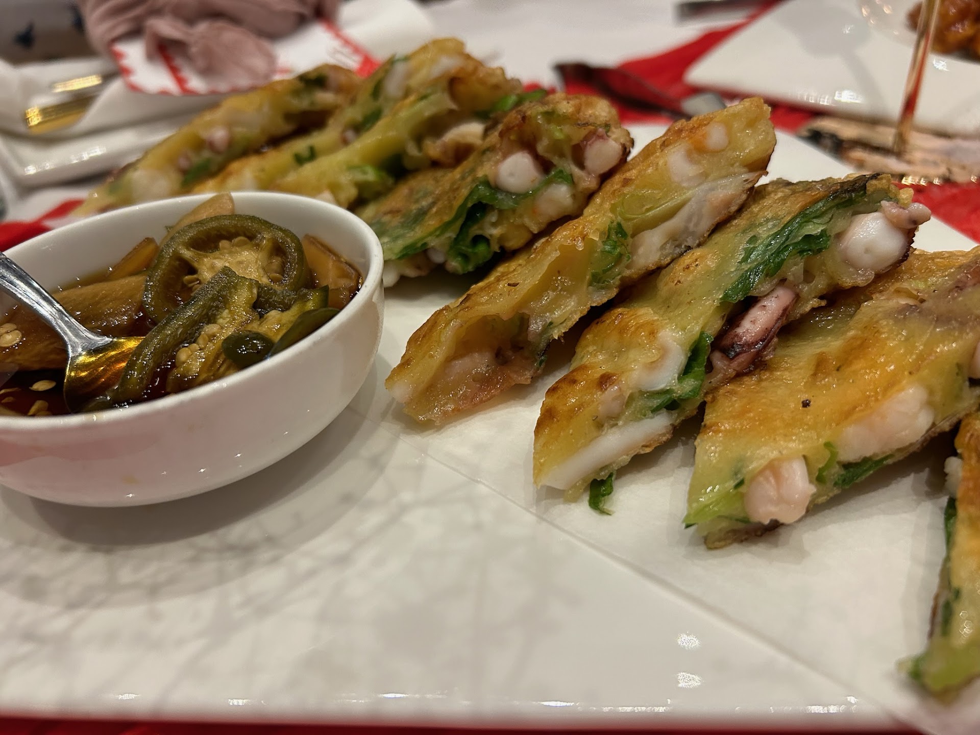 The food was delicious and perfectly timed, with a mix of family-style and individual plates that catered to all of our guests, even those unfamiliar with Korean cuisine. We started with the seafood pancake and chicken gangjung as appetizers, and everyone absolutely loved them—they were a big hit! One standout was the bibimbap, which came with the rice in individual bowls, while the toppings and barbecue (bulgolgi) were served family style, allowing everyone to customize their dish easily. The service was friendly, attentive, and efficient, making sure everyone felt welcome.
