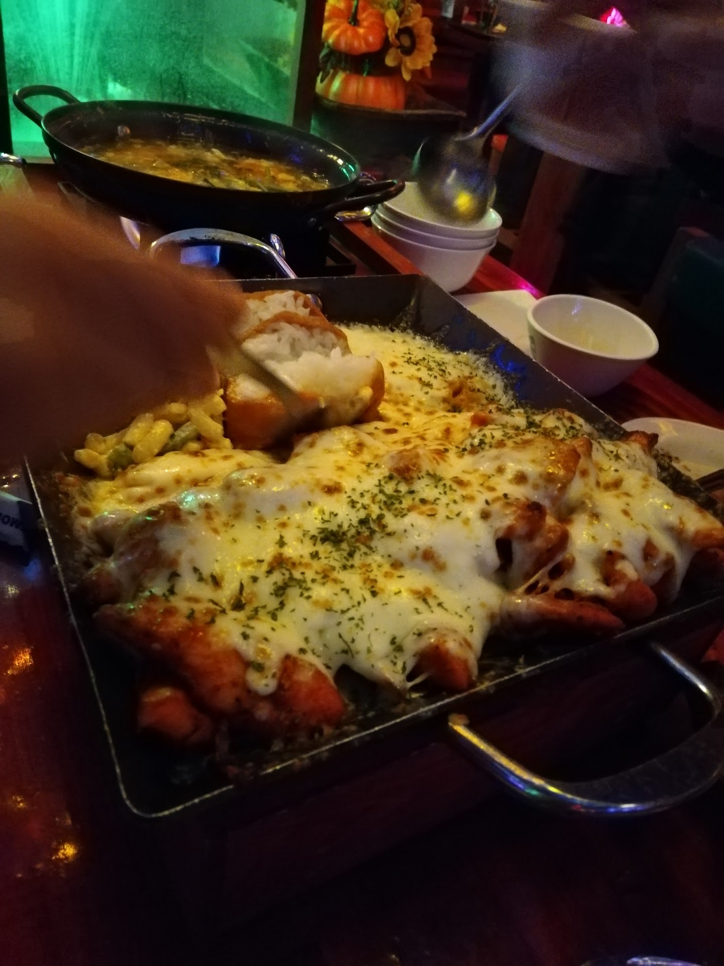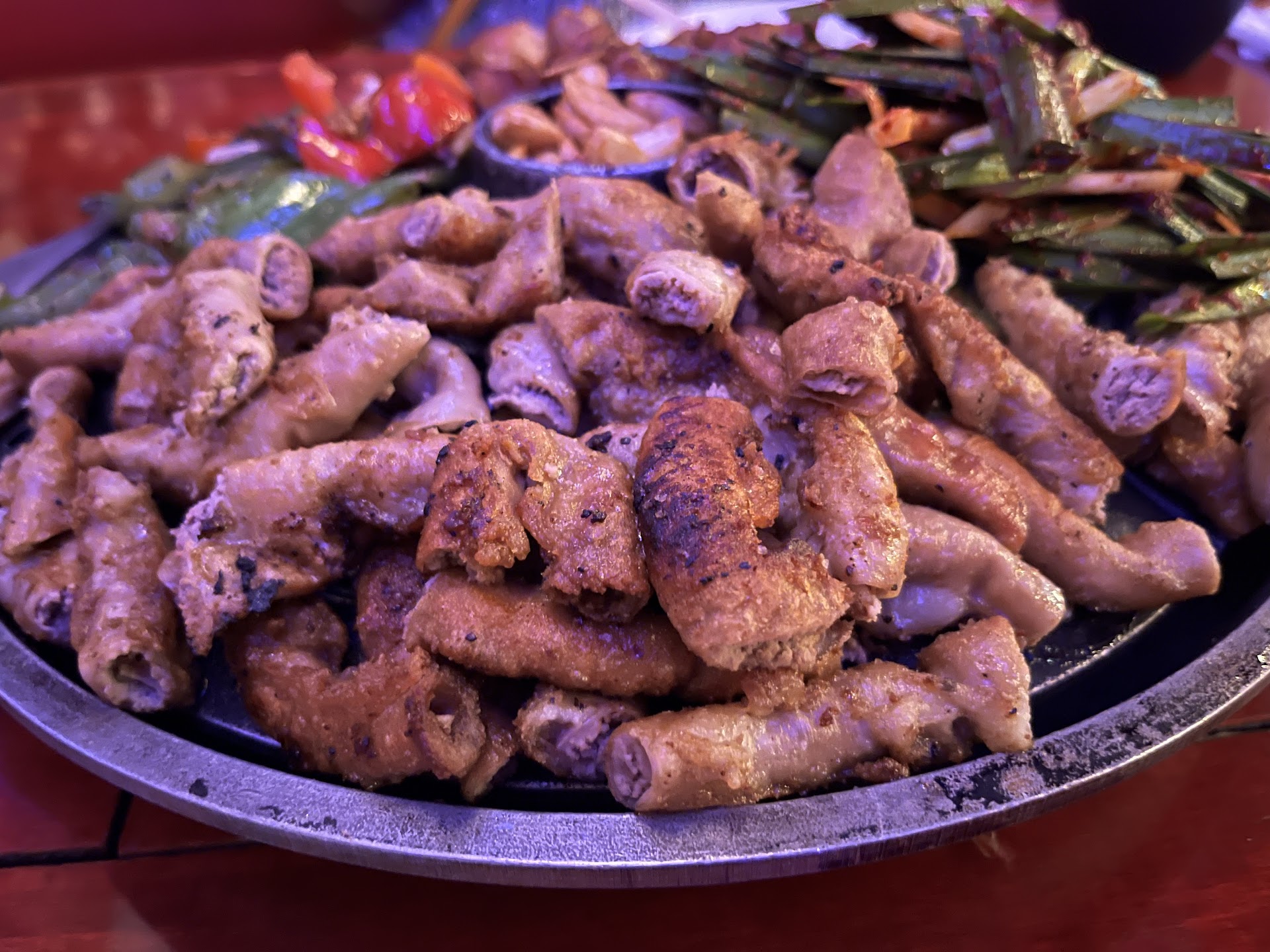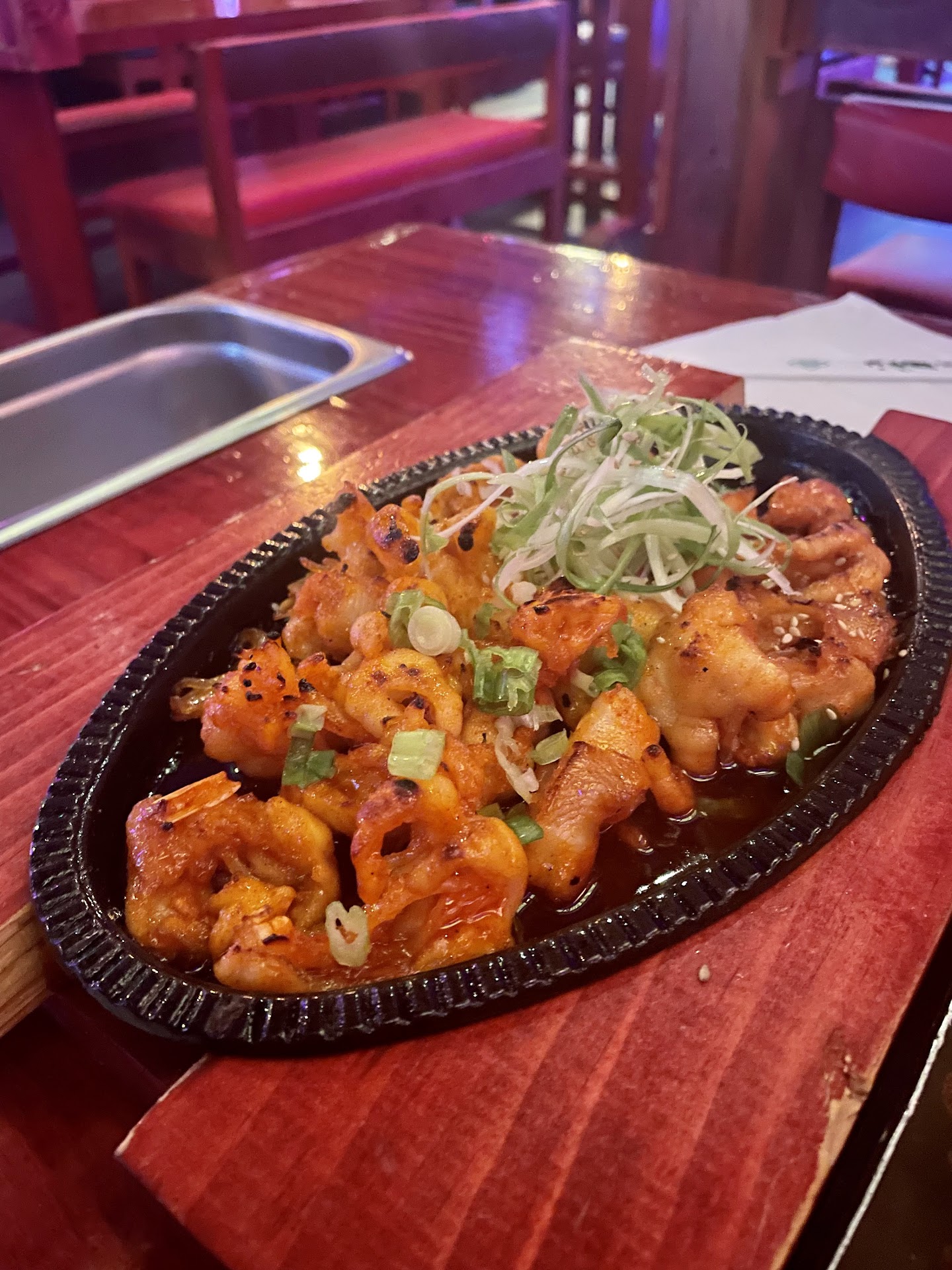 We got here at 7 on a Saturday. It was strange that only 1 table was occupied, so I was a little nervous that this place was not going to be good. We sat down in one of the booths. The decor was interesting that it feels like sitting in some local restaurant in inner city of Seoul. The menu on the wall was all Korean. Most of the seat seem to be torn. However, they are still comfortable to sit in. It was a little too dark to me at first but my eyes adjusted to it later and was fine. We ordered a spicy stir fry port with octopus. The taste was delicious but did not have a lot of pork. The octopus was a little undercooked. But it was fine. Then we have the fiery chicken with cheese. It was tasty, even the rice that came with it. My wife said the chicken was a little dry. But I am fine with it. The seafood pancake was delicious. Crispy and good taste. Lastly, we have the chicken feet. It was a little sweet at first but then was very spicy. I really liked the taste. The servers left us a lone until we call them. And they were polite. So, I am happy.