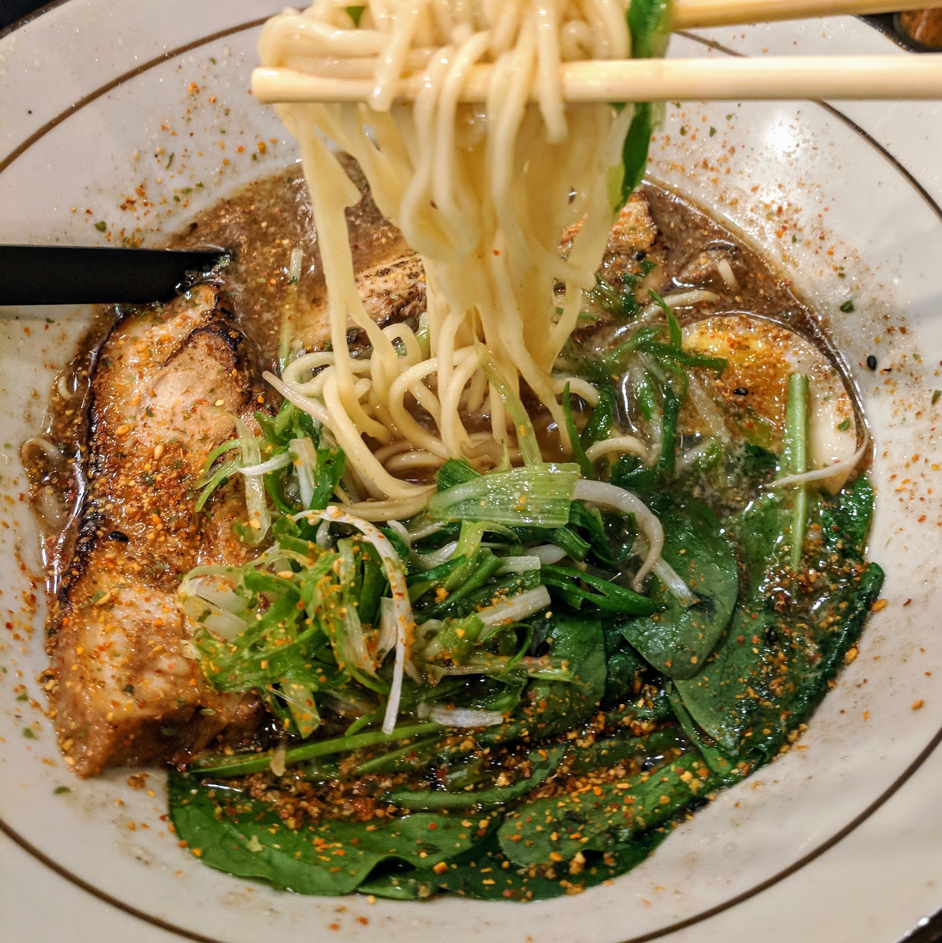 The "black ramen" (bonito) is my favorite thus far. The smokey fish flavor permeates the thick, creamy pork broth, giving it an umami reminiscent of a ramen-ya I found in a shopping center in Toyosu.