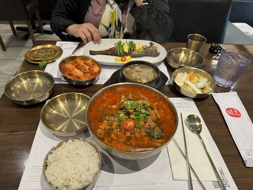 Went here today with my mom, I was excited because I love Korean soup, especially you yukgaejang. We ordered the yukgaejang and the fish combo can’t remember the actual name of the set comes with green tea. Food came I ordered the yukgaejang mild but it was definitely spicy. Fish was very dry and had a very odd taste. As we were eating one of the partners came Helen she was extremely sweet and kind the thoughtful who helped us how to eat the fish combo with the Tea and told us the history of it that it was originally created for the King. We loved her! As time came to leaving we had left overs I wanted to take home they brought Togo Tupperware for us however, after I packed it, I asked for a bag four different times One guy heard me, but he just ignored it well Come to find out bag is .25cents I didn’t have change so I asked them to charge my card it’s just weird walking out of restaurant with containers in your hand you know !!! He goes oh we can’t charge card for that ! It’s the NJ law we have to charge or bag !! EXCUSE ME! I just spent $70!! At your restaurant.25cents isn’t going to run your business down ! That shouldn’t even be an issue just to say oh here next time you can pay no problem! Absolutely ridiculous! I dropped the food going to my car had to throw all of it away I was so upset all because they couldn’t give me a bag. Extremely bad customer service! I will never come back or recommend this place !