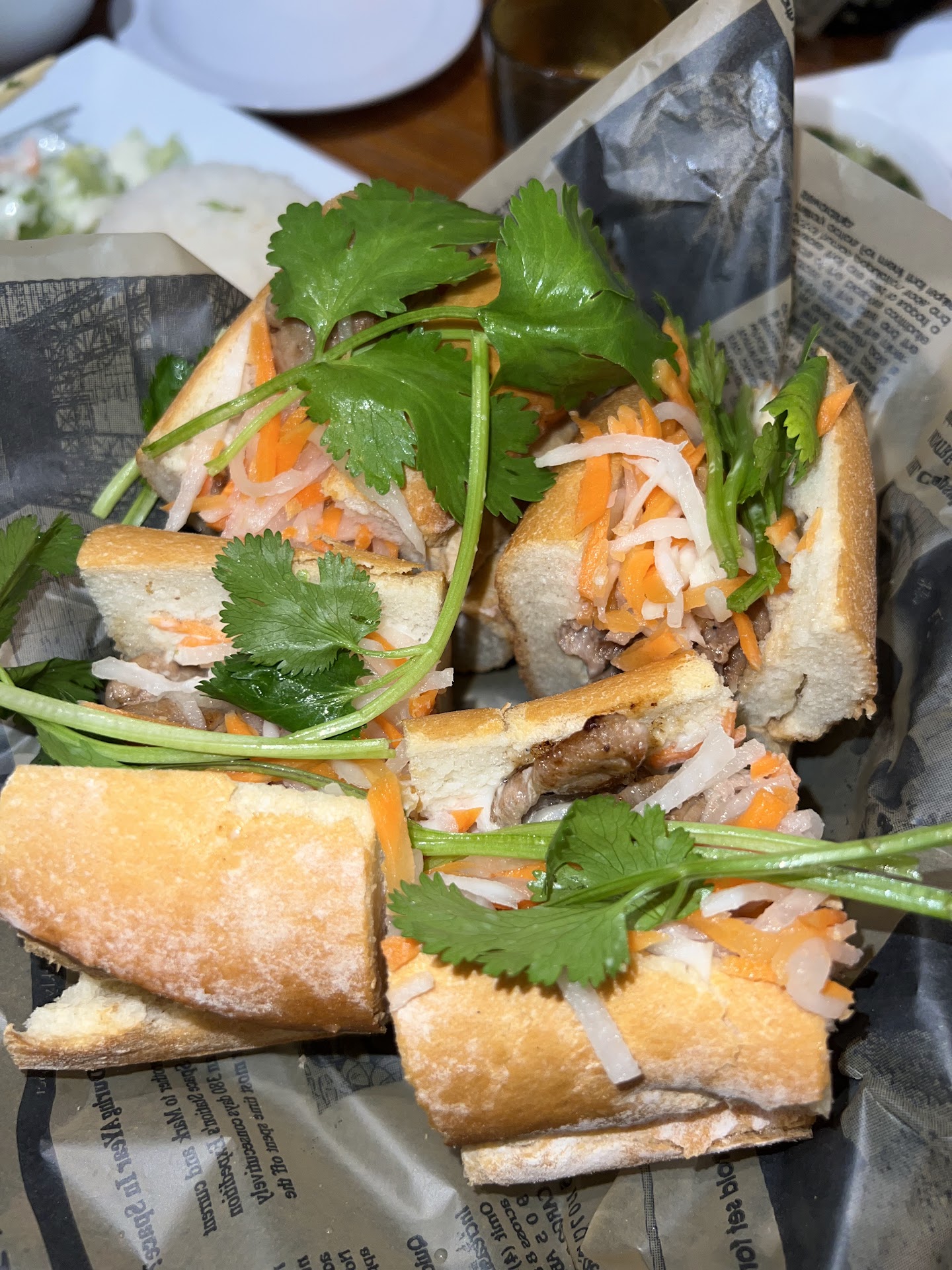 For my main, I had the vermicelli bowl with spring rolls. The spring rolls are the lazy spring rolls where they don't use rice paper, but just use spring roll paper. Instead of a bowl, the noodles are served in a cold chunk. And instead of a bed of crisp lettuce/cucumber, it's a side salad with a mystery mayo-based dressing. Hubby had the beef with rice dish, which came with the same side salad, and instead of grilled beef, it was more like a bulgogi. We also tried the pork banh mi, which was just fine but again, not really grilled like real Vietnamese grilled pork.