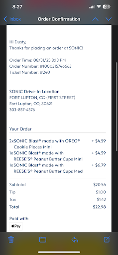 Ā Ā Ā Read moreOrdered 4 sonic blasts for my kids and I last night via the app. Got there about 15 minutes later. The mobile order stalls were full so just went thru the drive thru. At the speaker, I told the guy what we were there, he asks my name, give it to him, he says another name back, I say no, repeat my name, he says another name back, noā¦repeat my name again and he says they donāt have my order. I tell him what itās for, says hold on, comes back on and says they donāt have it. Tell him I got charged for it, says hold on, comes back again and tells me they didnāt get my order. I tell them theyāre gonna have to figure it out because I was charged. He says pull up to the window. Waited about 15-20 minutes for the 2 cars ahead of us to get their food. At the window, the kid asks what I ordered so I tell him again the 4 sonic blasts (2 mini Oreo, 1 mini Reeseās, 1 Med Reeseās) and tell him exactly what was in the app and in the email confirmation. He comes back like 5 minutes later and hands me a strawberry shake. As Iām trying to tell him thatās not my order, he closes the window and walks away. I knock on the window, he comes over, i hand him the shake back and tell him itās not mine. He asks me AGAIN what I ordered! I looked at him and asked if he was high because we literally just went over this a few minutes ago and what the actual hell is going on. Asked for a manager and he tells me āsheās back there making them.ā Another guy FINALLY brings my order to us. Fort Lupton doesnāt have many food options so it really sucks when the service received at what little places we do...