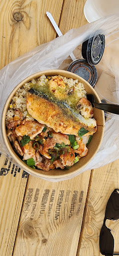 First off, the lady at the order counter was sweet. She took the time to explain my opinions and made some great suggestions. The food is made to order. It was very good. The gentleman that brought my food to the outdoor table was very polite. He even insisted that I had some ice-cold water with my meal. I will definitely be back. The salmon, pork, and rice were amazing. The rice was spot on . The salid was also. Not to mention, the sauces...