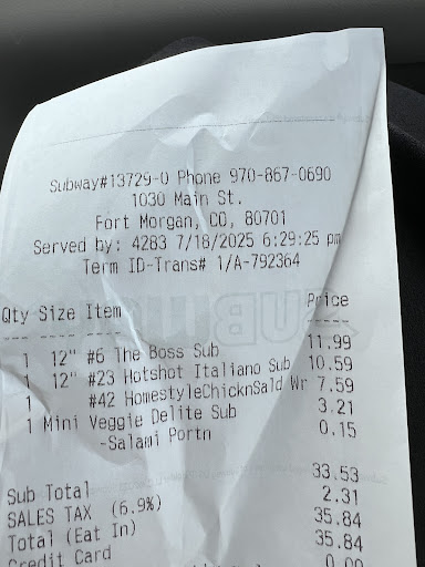 Read moreI wanna take a moment to thank the subway employee named Kevin. I went in there came from a subway and Brush over by the gas station. That one is terrible but the one here in Fort Morgan by the Verizon store is excellent. Kevin stopped what he was doing. He greeted me when I came into the store. There was another employee that was working hard cleaning the lobby and the bathrooms doing a good job focused. Kevin was cleaning things also taking care of things assisting the other employee and he was very kind patient courteous, friendly, good positive attitude working and helping customers. If I ever owned a franchise, I would totally hire Kevin. He’s the type of employees that I would want working in my stores. I hope that the owner and boss manager give Kevin a promotion and give him a good raise for doing...