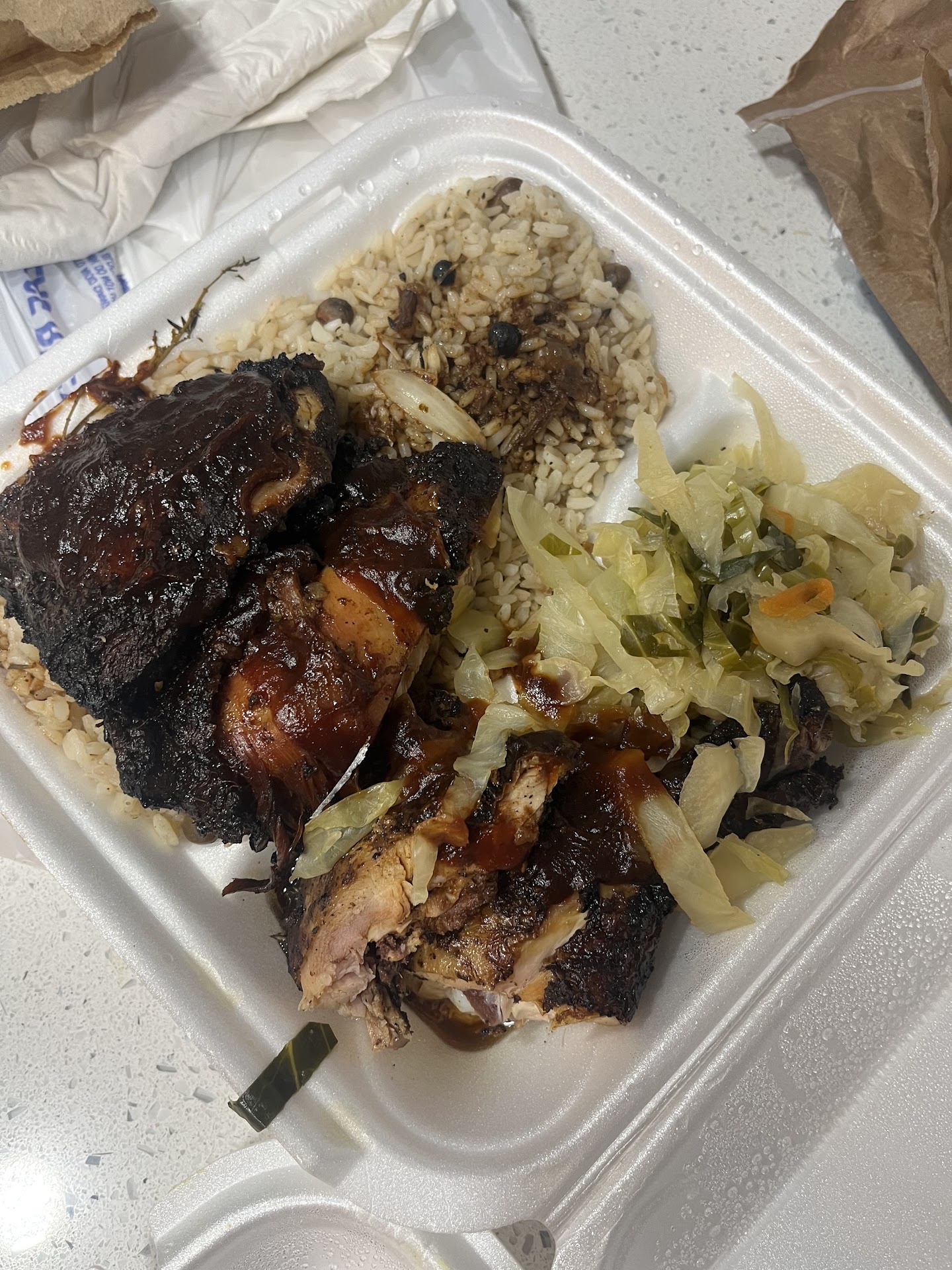 I loved the food! The food had a great spicy kick to it which was phenomenal. 🔥 And not overbearing either! 🥵 I had the Jerk Chicken and Curry Chicken dish, both with Rice & Beans with Cabbage. The cabbage had a little bit of collards in there which made me feel better about cheating on my diet 😉 Had a good amount of flavor and was NOT heavy on the garlic like some other Jamaican restaurants do.