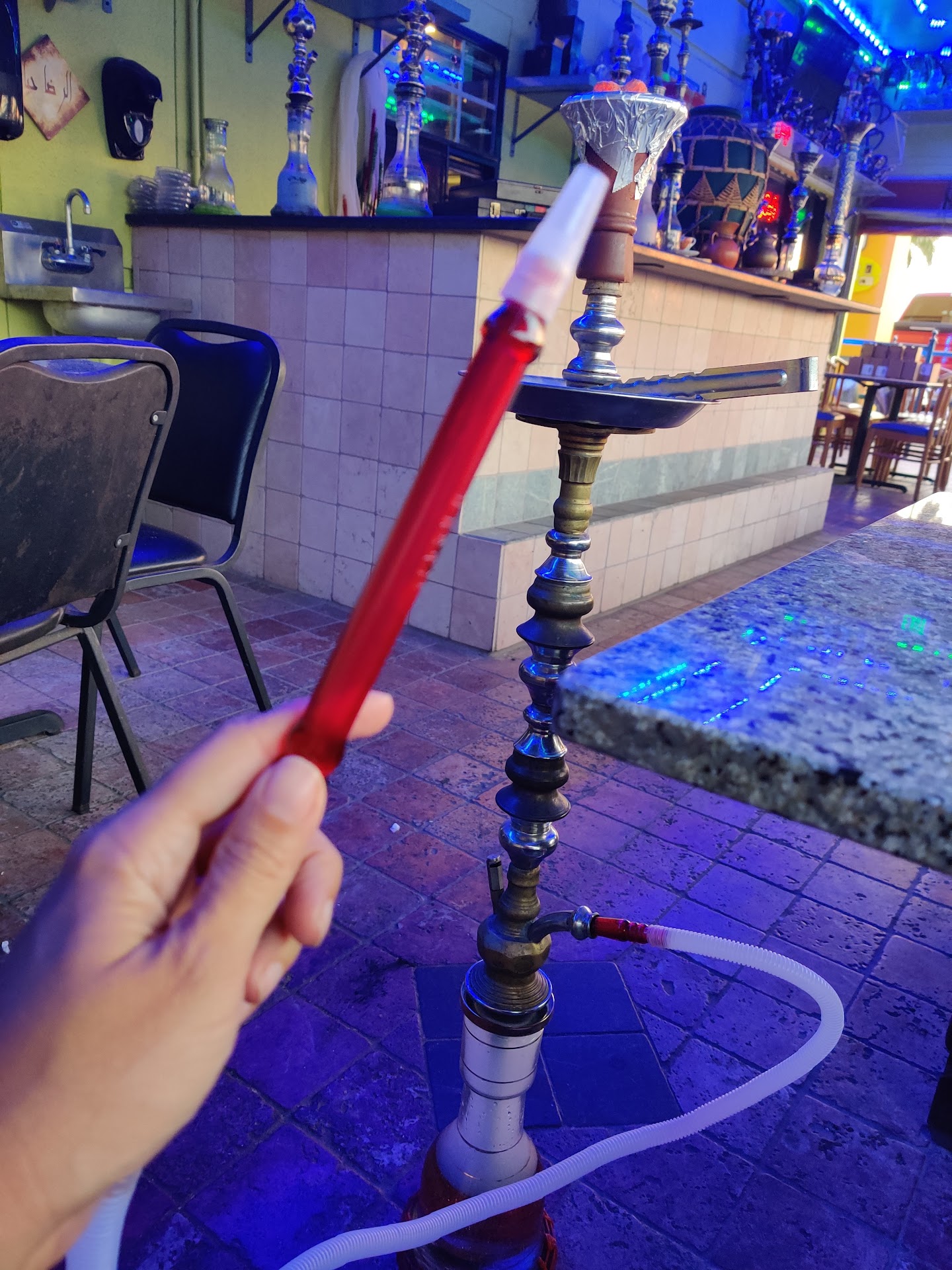 The biggest surprise was the bill?! We were charged $26.99 for a single bowl of shisha!! Plus and additional $2.99 for the extra coals - which not only did we have to chase down and ask for twice but without a wind cover our first coals only lasted 35 minutes. You should get 60-90 mines from a bowl with 3 coals. Total rip off. We were sticker shocked to say the least and won't...