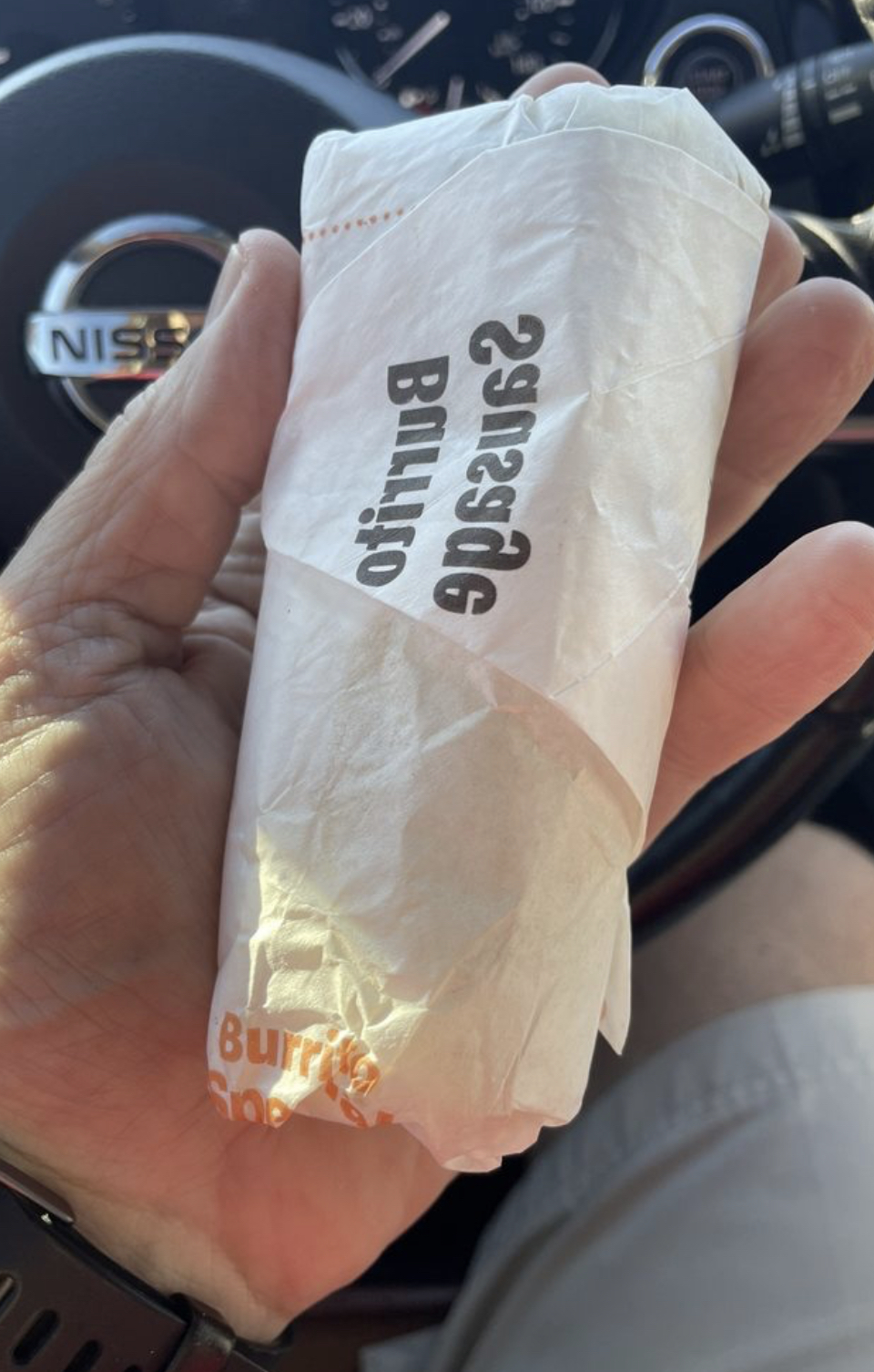 After we pay, I look at our receipt and it shows an apple fritter and no scrambled eggs. Now I am on a diet. I cannot eat this apple fritter. I want my scrambled eggs. So we get the bag at the next window and we tell the girl what was wrong. She starts to ask for the money for the scrambled eggs. I again explain that I have already paid for an apple fritter that I do not want. She asks for my receipt which I provide, and then demands I return the fritter. I do. She disappeared somewhere and returned with a bag and we left.