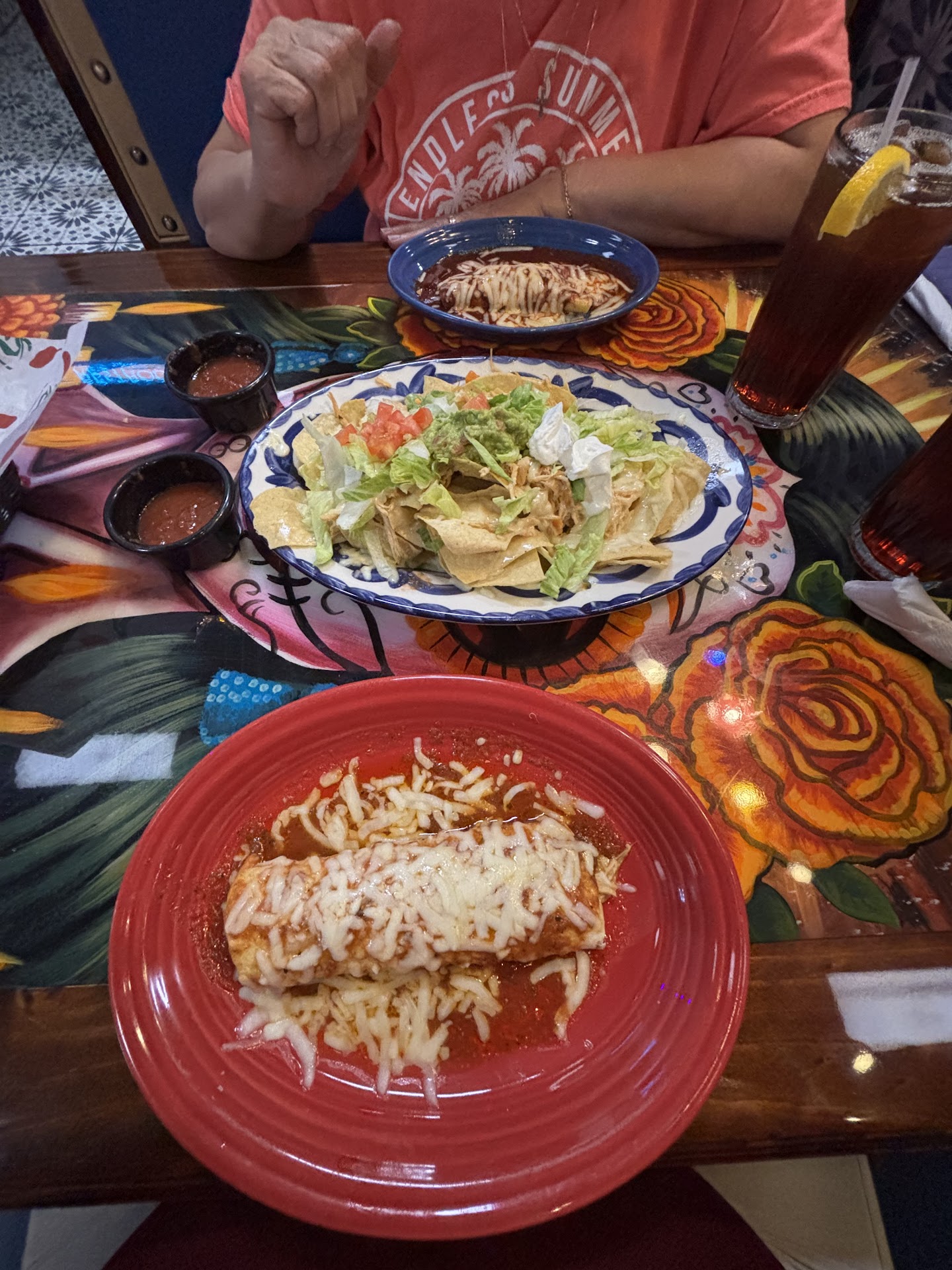 Read moreFirst time here….was sat down immediately which was nice…once seated near the bar we got our chips and salsa. They were good but the chips were cold. It took about 10 Minutes for the waiter to come to our table to get our drinks. We both got sweet tea 1/2 unsweetened. It was all sweet. The waiter took our order. Within 2 minutes our food arrived (I was surprised) my first thought was this was a one time frozen and they just put it on a hot plate and warmed it up or put it in a microwave. The Plate was hot ….had high hopes for not only us and dinner but the restaurant. The chicken burrito was warm, but not hot. The Chicken nachos were just thrown together not layered with the cheese and chicken and lettuce and tomatoes on every level. 1/2 way thru everything was cold nothing but cold chips. Wife also got a chicken Burrito, it was lukewarm. Very disappointing. A lot of staff running around many on their cell phones not really paying attention to customers. Of Note the music was extremely loud and my wife and I were unable to hold a conversation over dinner. Will try again to to see if it was anomaly. I hope...