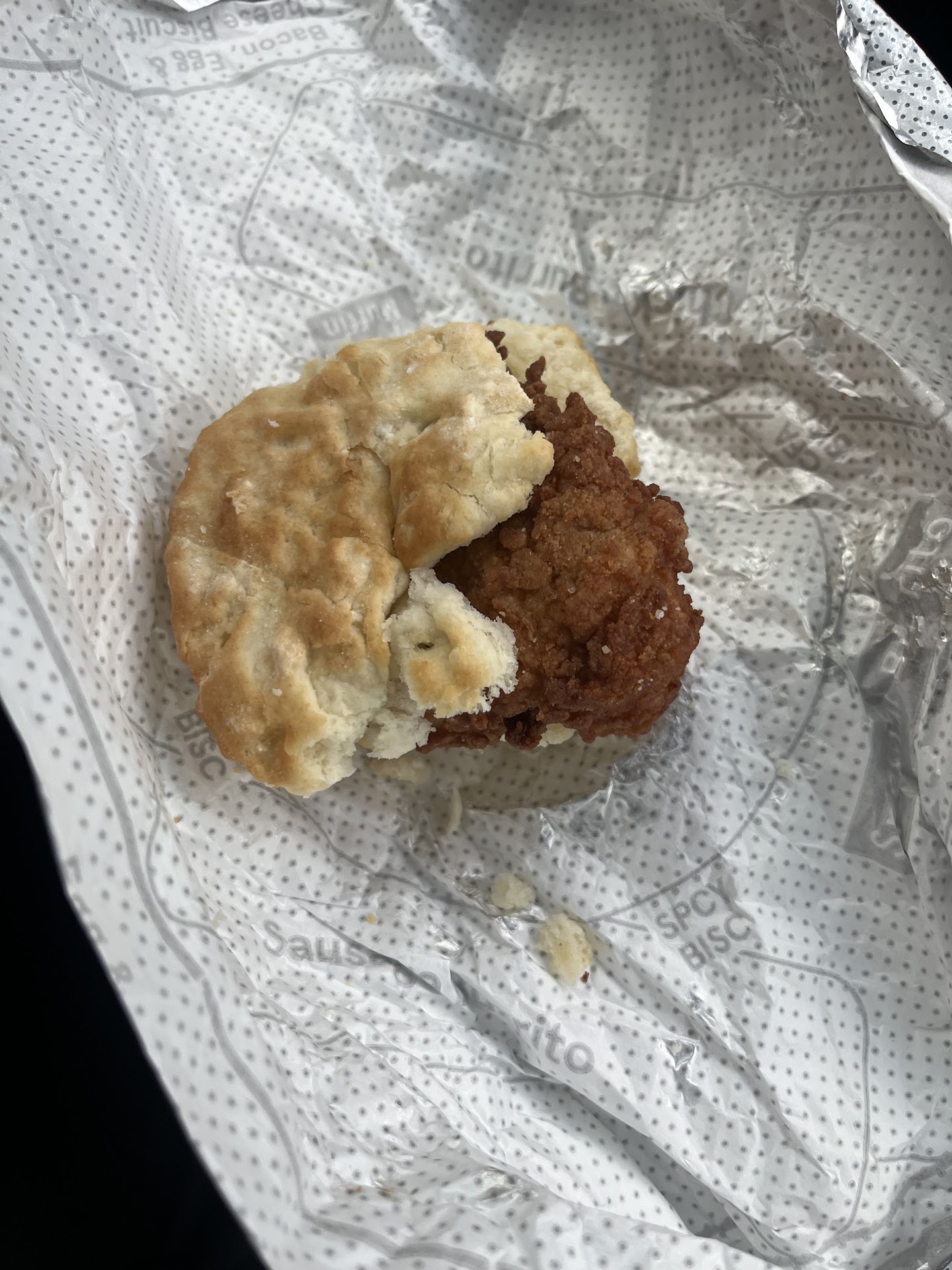 The quality of your chicken biscuits has been inconsistent. On multiple occasions, I have received biscuits that were either overcooked or undercooked, making for a disappointing breakfast experience. An undercooked biscuit is a gooey gross mess. It seems like there's a lack of consistency in the preparation process, leading to varied results.