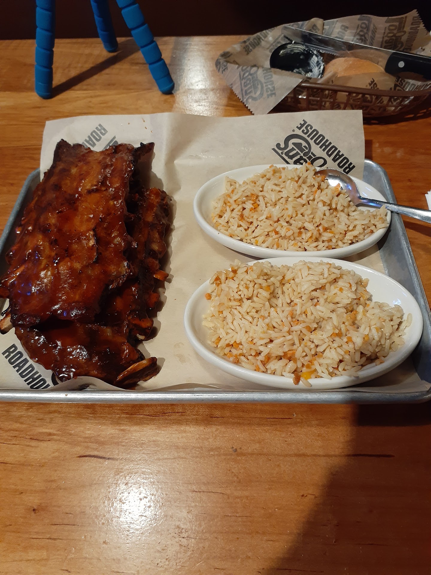 And that's where the good ended....mostly. She brought rolls but they were solid and not Logans yeast rolls. Not a big deal but weird. The food came next. The kids got burgers (medium well), fries and a side of their new coconut shrimp. I ordered the salmon with shrimp (has small amount of mashed potatoes and a cream spinach sauce). The shrimp were fishy, not bad but not good. They were tough. They were warm. The spinach sauce cold. The salmon overcooked and extremely hot (enough to burn your mouth), and the potatoes were cold. I had two salads (kid #1 ate one) so that was all that was on the plate.