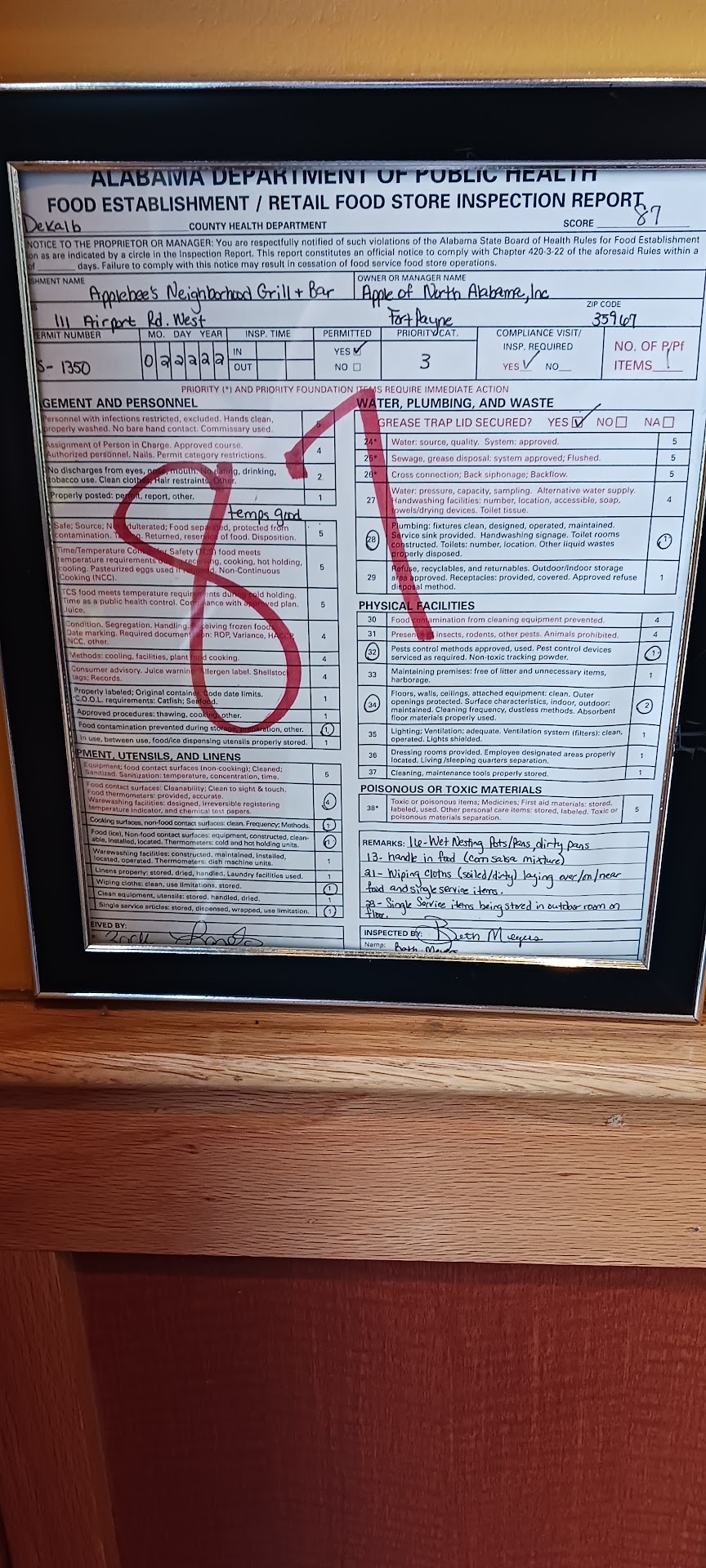Read moreI been visiting different Applebees' locations for the past 20 years. I never experience such a horrible experience like this week. I started going to this location when it first opened up and the service was great but now it is horrible. At Fort Payne, AL location last week at lunch time around 2 p.m. it was bad but nothing like this week. Last week food was cold, old and rubber chicken. Potatoes. were cold and lumpy. The steaks the first was undercooked but second one was better. It was brought to manager's attention. It was somewhat corrected last week. Today at Fort Payne, AL location around lunch time or 12:12 p.m. it would be negative stars if possible. My husband experience food poisoning at this visit. He threw up his meal after leaving the restaurant. It took close 30 minutes to get a drink order in at this restaurant. The waitress not that attentive to us it took forever get our drinks and food. Everything was so terrible I would not want my enemy to eat here. Today I ordered one 12 ounce ribeye with broccoli with mashed potatoes. The first rib-eye was overcooked and second rib-eye was raw. I did not order anything else on my part of this order. My son's order pizza & cheese sticks were okay and warm. The white queso & chips were hot & fresh. The boneless wings were cold and had be made up. Second time boneless wings were okay and warm. My bourbon street steak 8 ounce with shrimp. The shrimp was okay with the potatoes. The street streak was hot but tested like it had soap inside of it. This bourbon street streak was cooked twice and had soapy taste. My. Husband was sick also at the restaurant due to the soapy taste, bourbon street steak. Both visits weren't on weekends( Saturday) at lunch time. I think someone should look into how poor and horrible food was and service that was provided at the Fort Payne AL location of Applebee's Grill+ Bar. I not sure if I will return to this restautant location ever again. Do not recommend this location on Saturdays at lunch...