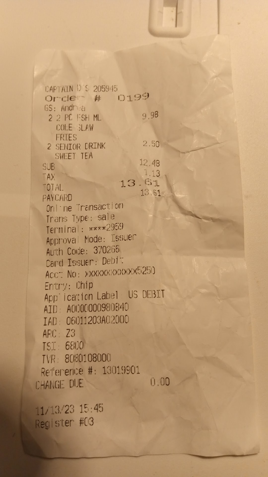 Read moreI previously went though the drive thru and got the family dinner however, the food was absolutely horrible. I’m not one to complain but I in fact called Captain D’s and told the manager how bad the meal was. She was very apologetic and stated she would put my name down to replace meals at no additional cost!!! So a few weeks passed and I remembered our meals but when I informed the manager( Robert) he looked in the book and my information wasn’t there. I was speechless 🙁 however Robert was so kind and professional and indeed replaced our meals with no questions asked. My grandson was at my side and the biggest smile came across his face. To Robert you are truly my hero of every manager had some of your qualities our dinning experiences would...
