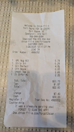 Ā Ā Ā Read moreI say 4 stars only because breakfast wasn't great I got the egg white grill.the grilled chicken was extremely dry.the American cheese was melted all over the foil wrapper.I could of complained to management.but I'm one to give them the benefit of doubt.the 1st time I order a menu item.if the 2nd time I order the menu item.&it's prepared as previously was done.then I usually say something.the small fruit cup was good however.I went the day before for lunch.my market fresh salad was good.so I figured breakfast would of been.but it wasn't .not what I expected.I also got for lunch a peach milkshake.no whip cream no cherry.it was great!!!!!!!!loved it loved it.this is the1st.chick fil a I'd been to since the 1 in Gadsden mall.way back years ago.the staff were great friendly & very curiutous helpful. So I'll be back& hopefully breakfast will be better.highly recommend the peach milkshake.gettcha 1it's great for a limited time only...