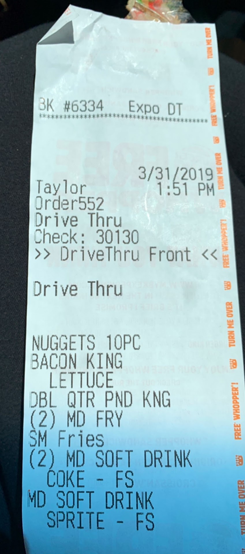 Very disappointed. The cashier N**h, was just there. Did not up sell or ask for here or to go. I wanted the BK King whopper, but because he didn't speck clearly I ended up with a BK XL. While waiting for my order, went to the restroom. What a mess it was. Paper towels on the floor and trash running over. When I got my order, I was missing an order of fries. He points out each fries went with a meal. I had to point out that I had purchased an extra order med fries. He filled the frie cop, overloading and spilling on the floor. The new fountain was out of most flavor drinks and one machine was out of ice. Makes matters worse, BK XL was warm and fries were warm. The only reason I didn't return anything was because the got a huge crowd. (McDonald's had there drive through only. Short of staff). This what a patron shared with us. Will think about it twice, before stopping at this one again. $20.00 is a lot of money, to be dissatisfied. I am so, glad I wasn't a...